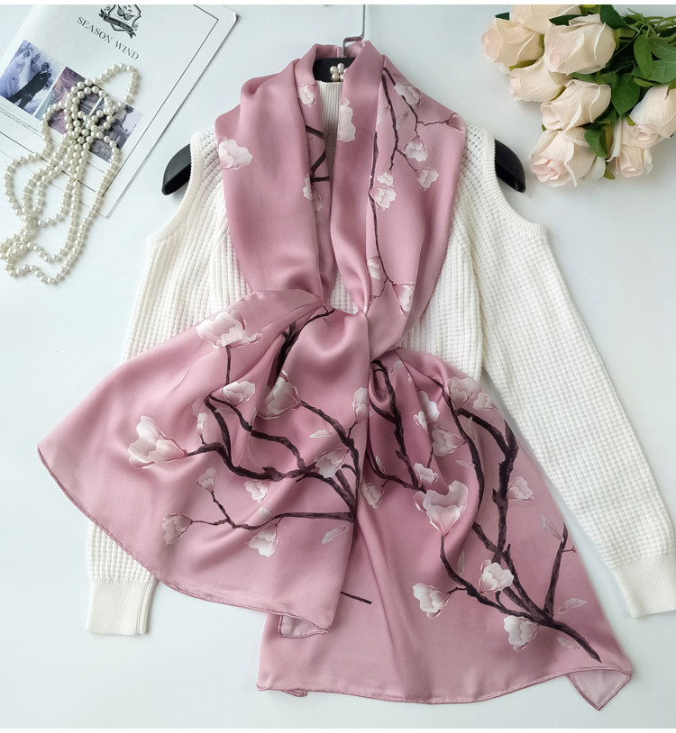 China Wind Pink Lotus Upscale Satin Real Silk Scarves Women 100% Mulberry Silk Scarves Hangzhou Silk Shawl