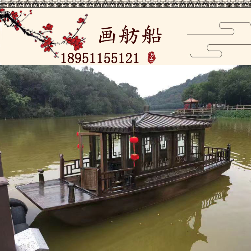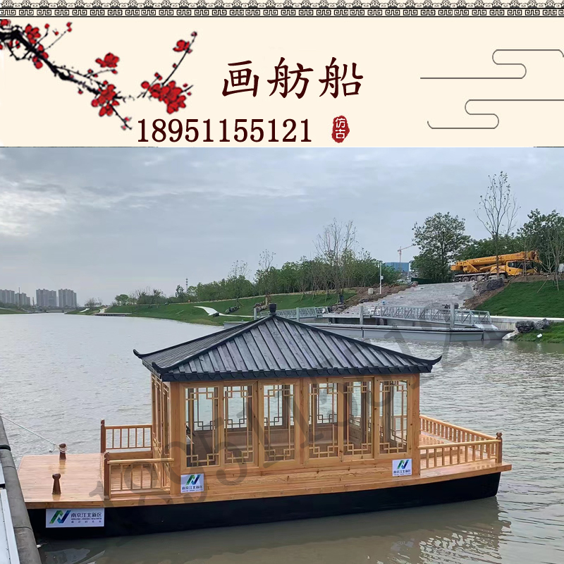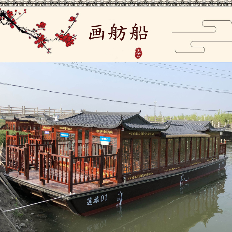Wooden boat painting Boat Boats Solid Wood Large Water Catering Ship Imitation Ancient House Boat Wind Scenic Area Double Electric Tourist Sightseeing Cruise Ship