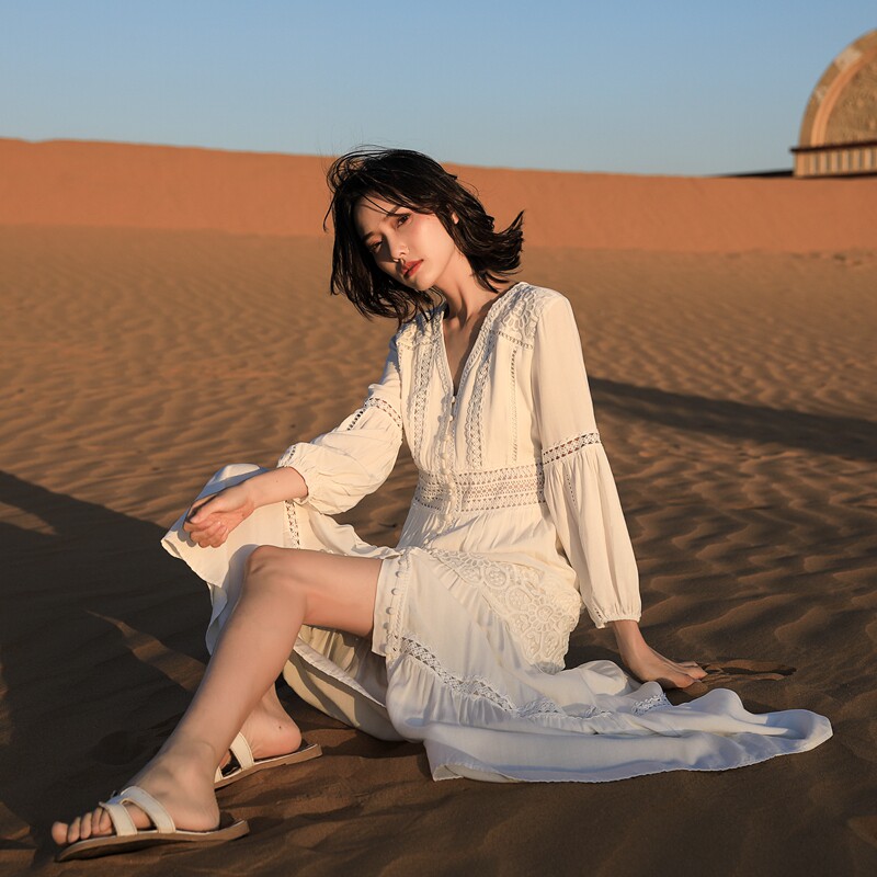 Sanya white dress photo forest fairy seaside holiday long dress sunscreen long sleeve beach dress female super fairy