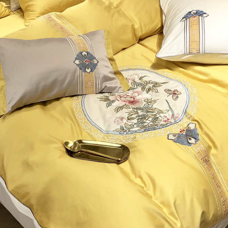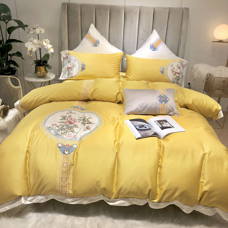 New Chinese Embroidered Pure Cotton Four Pieces Chinese Wind Comeback Ancient Elegant Yellow small fragrant wind quilt cover 1 8m bedding