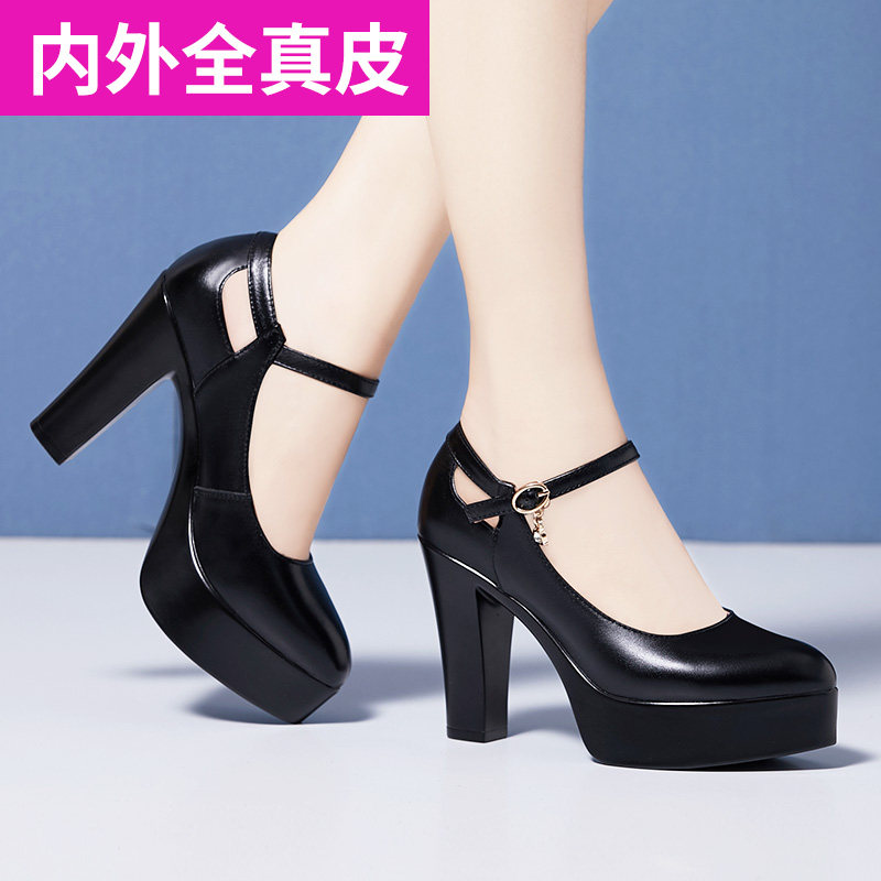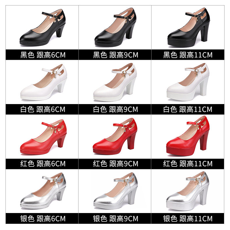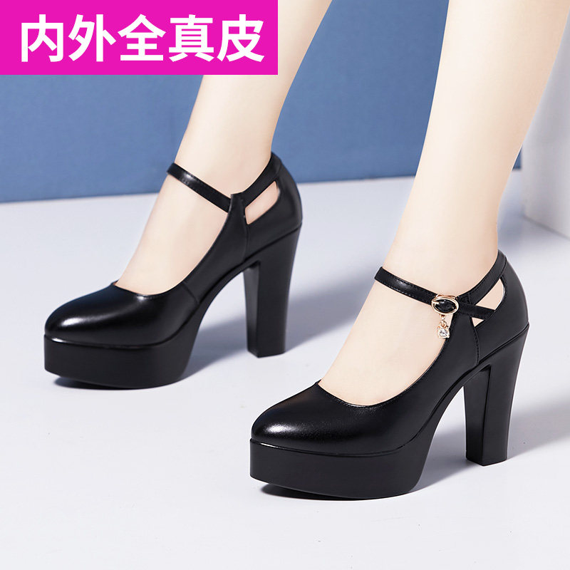 Real leather model training special high heel coarse heel waterproof bench Soft Bull Leather Qipao Walk Show Shoes tdesk performance single shoe woman