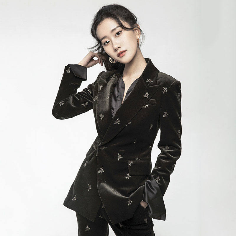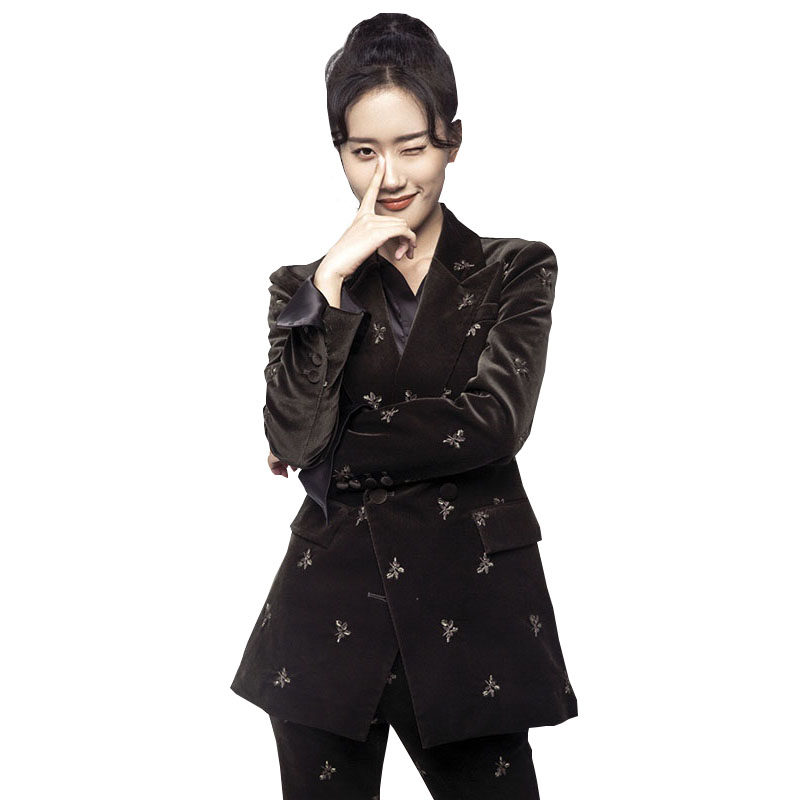 Autumn temperament black high-end light luxury gold velvet suit female high-end professional embroidery suit two-piece suit