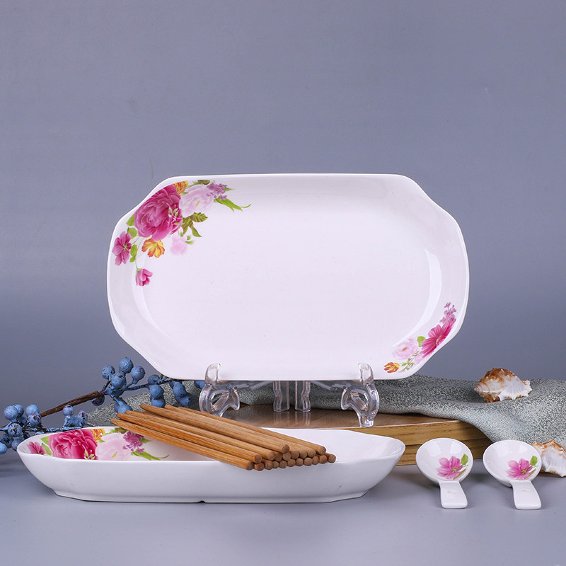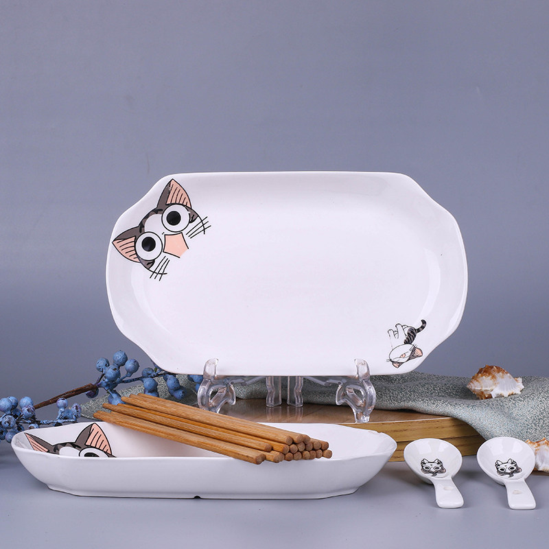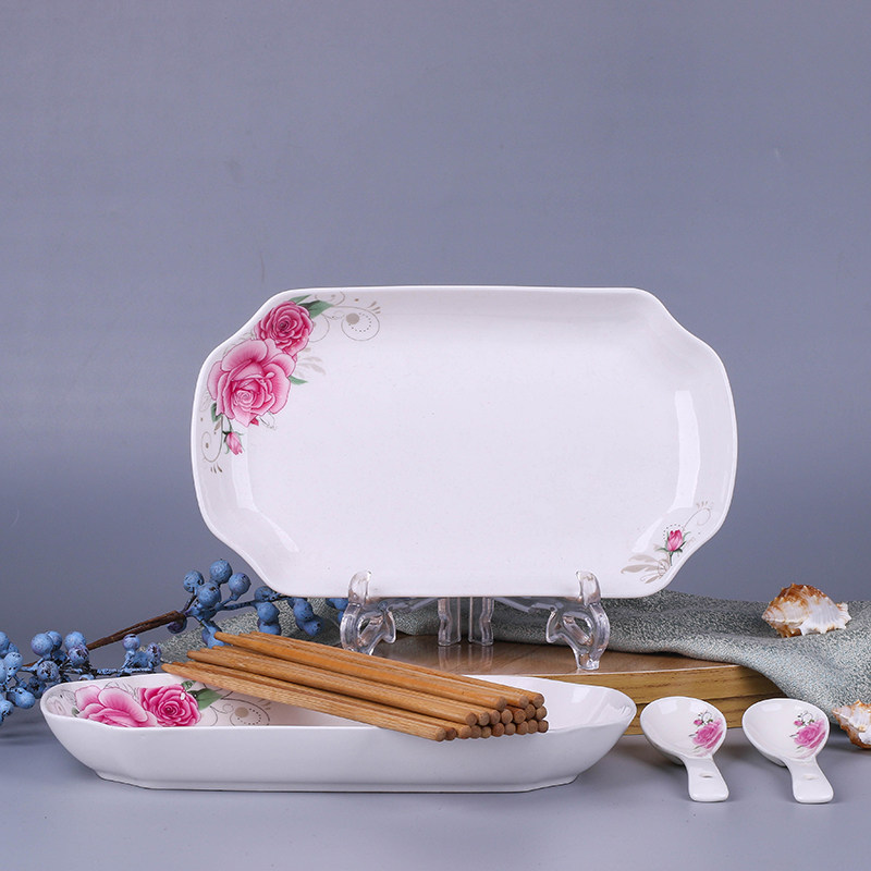 2 fish plates 2 spoons Ceramic household plates Creative rectangular Chinese microwave oven porcelain plates Simple meal