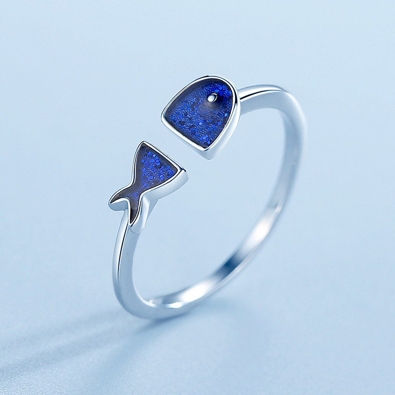 925 pure silver blue small fish ring female cute super cute sweet and beautiful adorable girl with adjustable size index finger ring