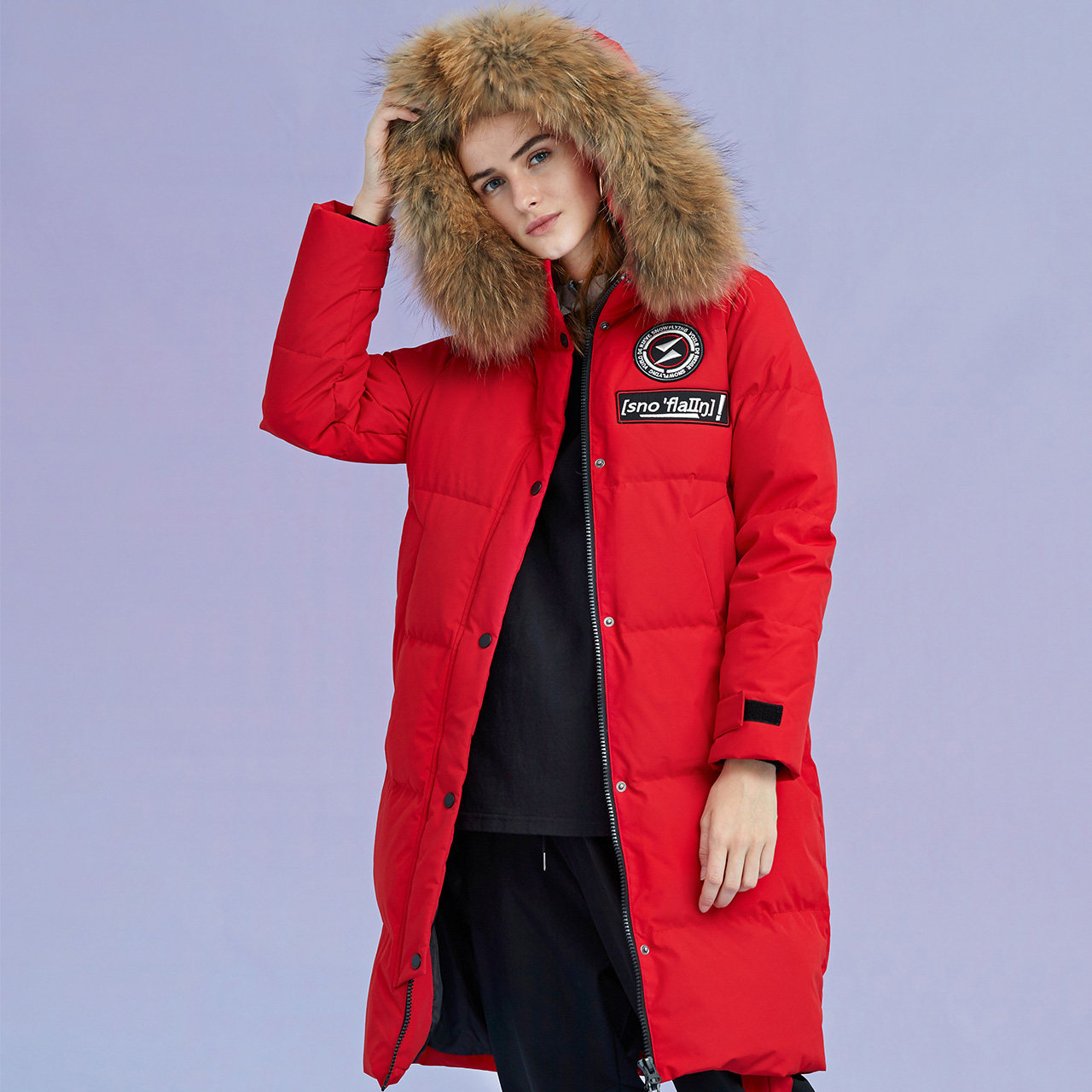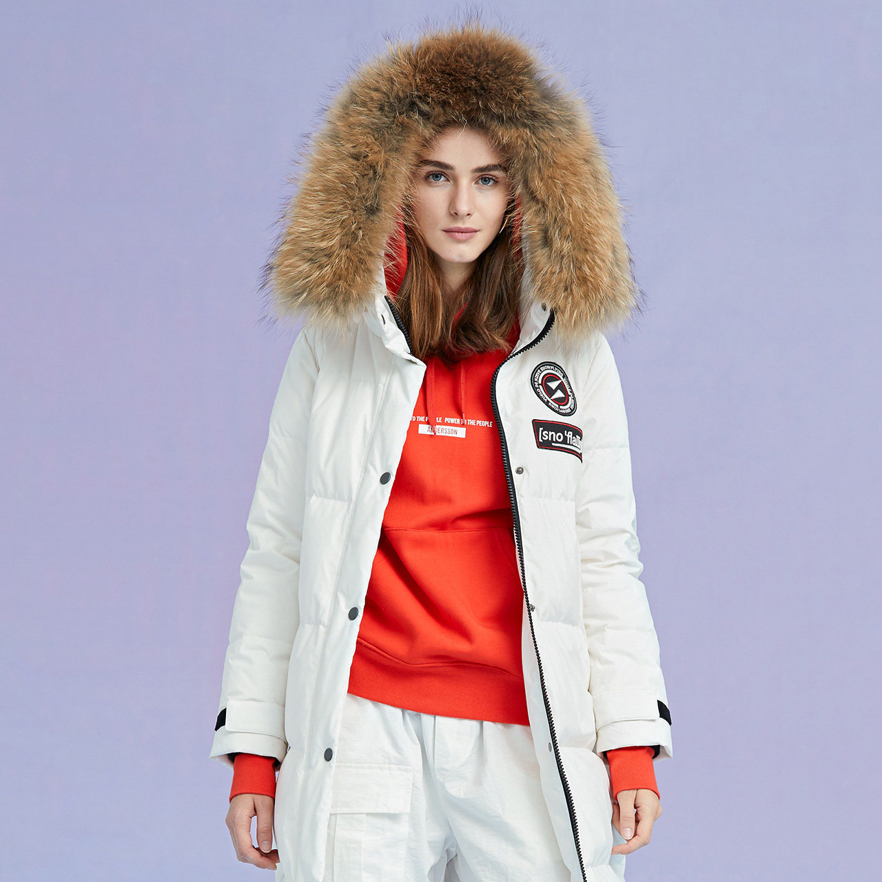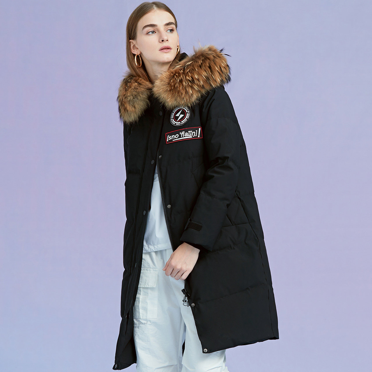 Snow medium flying 2021 autumn and winter new fashion fun sleeves Pocket Women with cap Mao collar down jacket X90140062