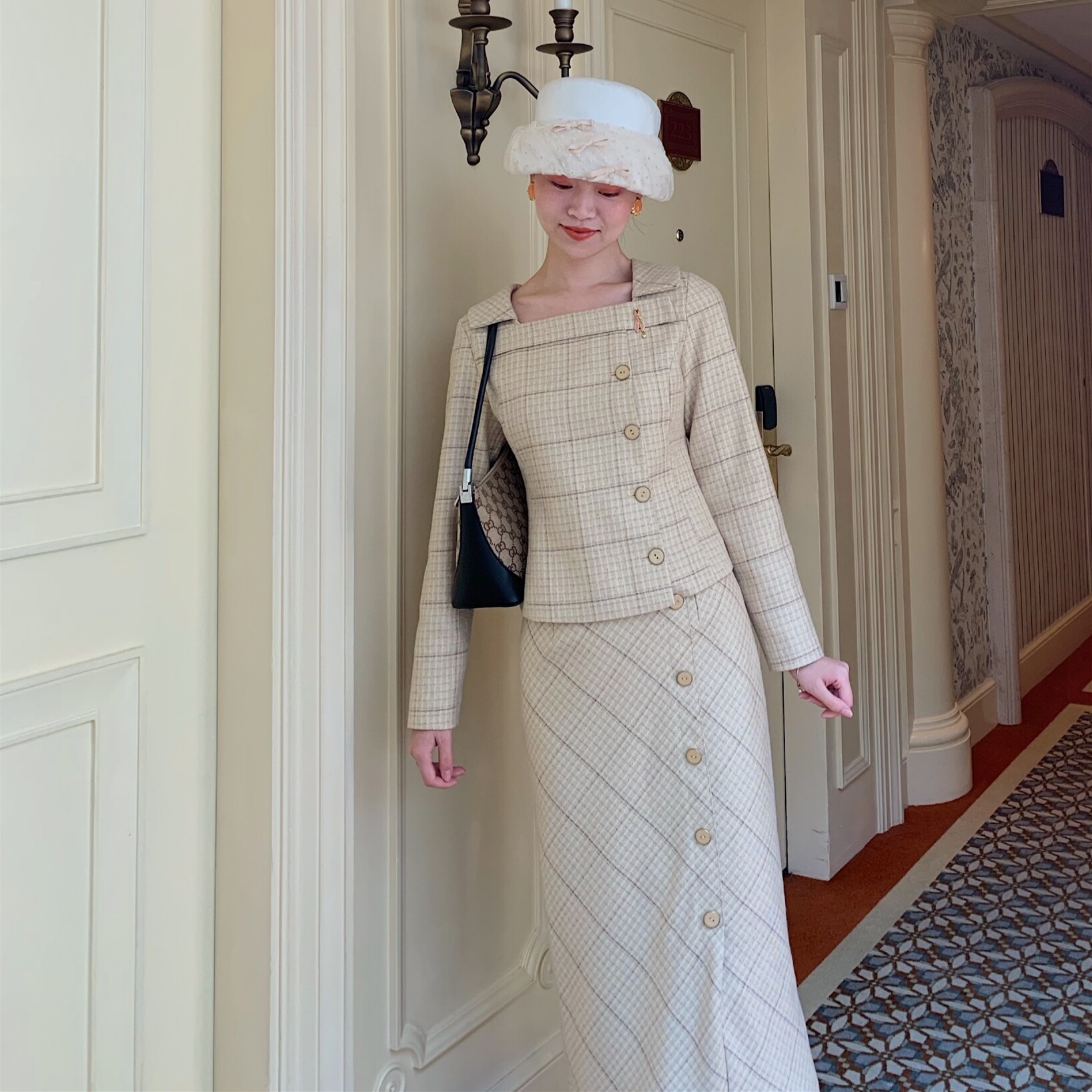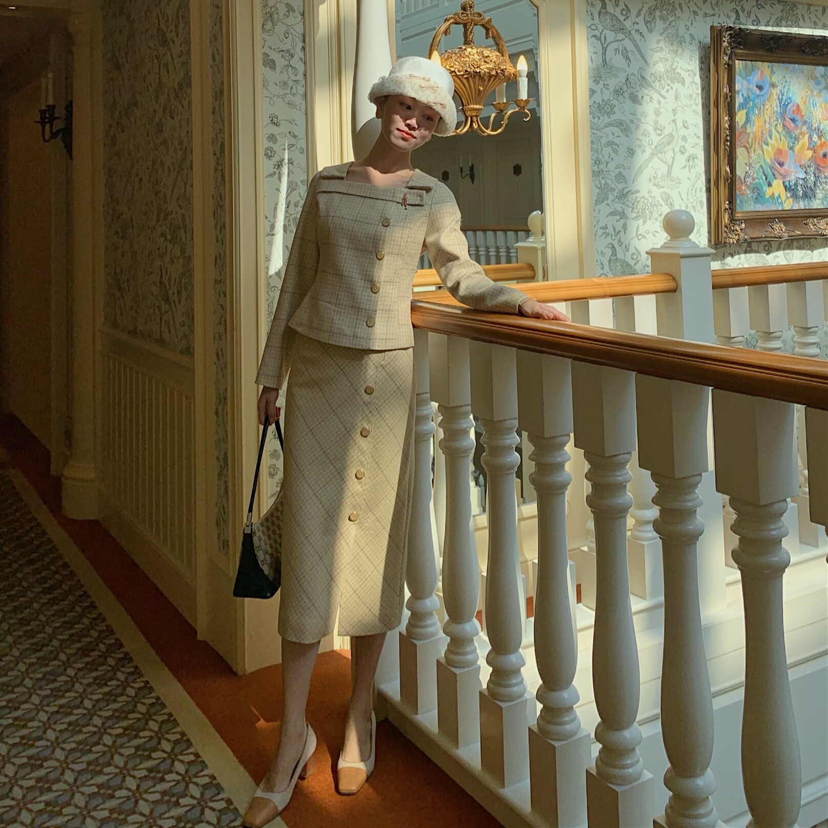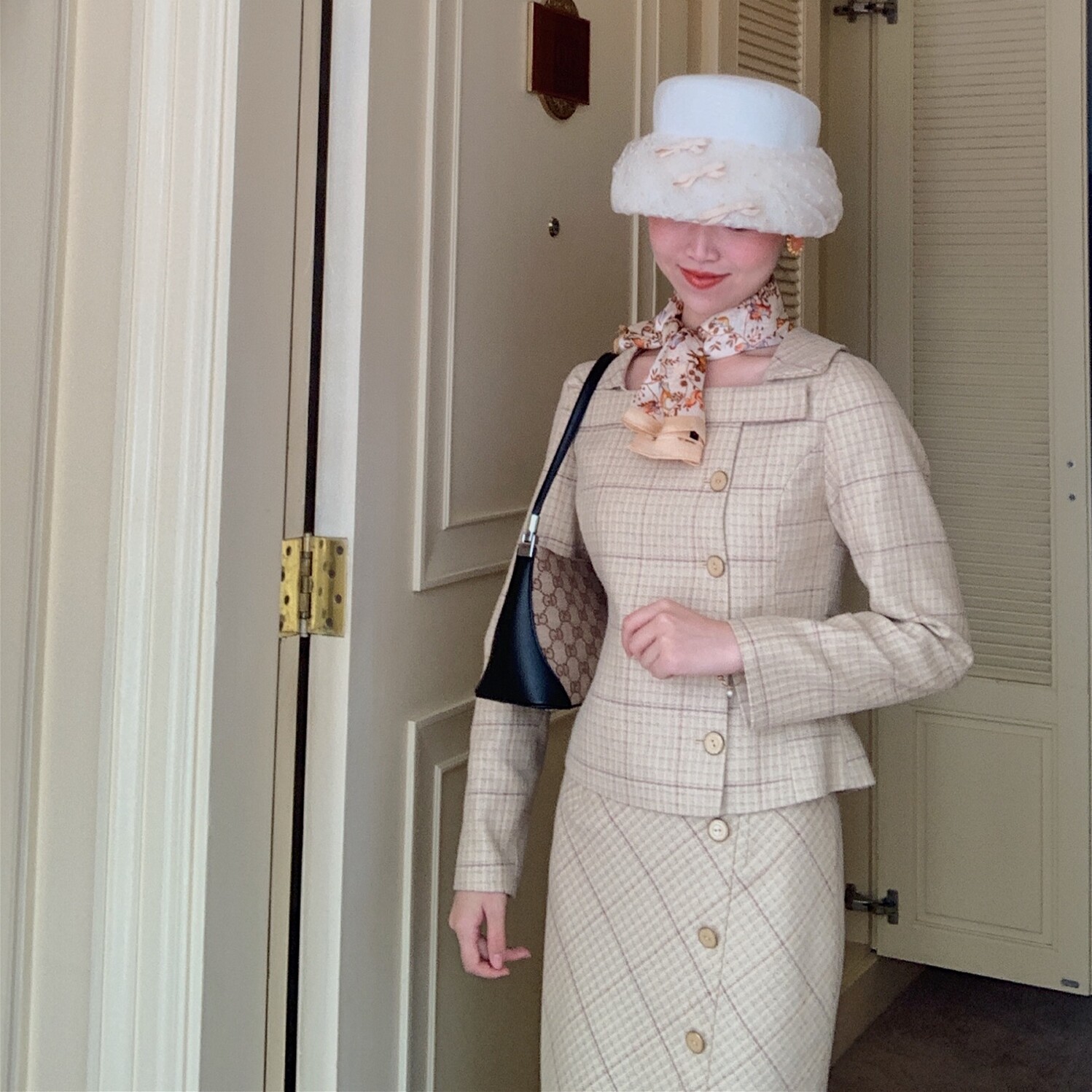 WangHanYan2020 Early Spring Ocean Pie Retro Lattice Dwarf small Fragrant Wind Fashion Suit woman Two sets