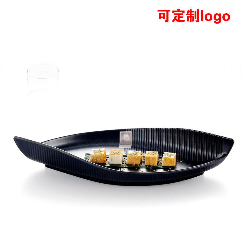 Imitation porcelain Japanese and Korean irregular frosted sushi snacks boat-shaped leaves black plate drop-resistant melamine tableware dish plate