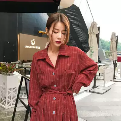 European station 2021 autumn new plaid coat women's ins retro waist loose knee long version dress women
