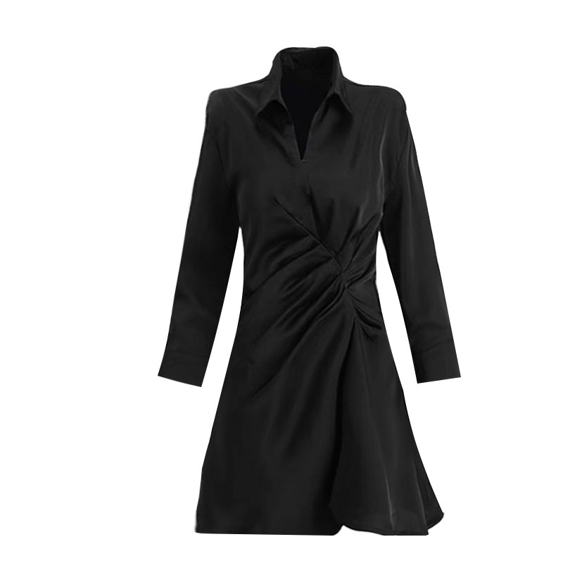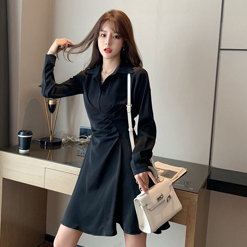 Black dress women's spring and autumn French bellflower retro temperament waist was thin and long-sleeved Hepburn style shirt skirt