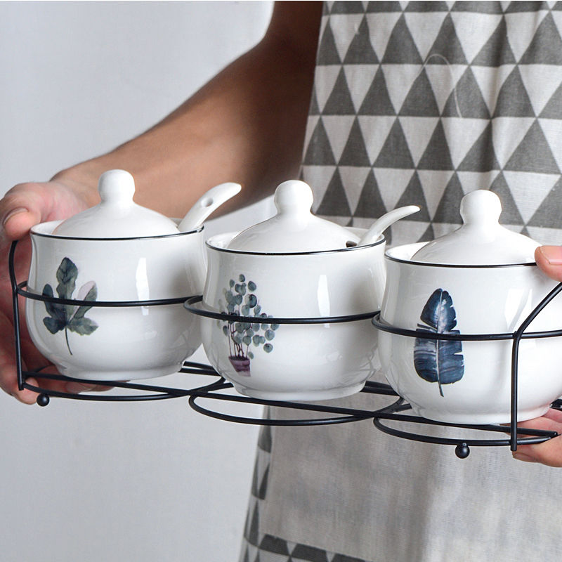 Ceramic seasoning jar Three-four pieces mesh Red home Seasoning Jar Bottle set Salt Jar MSG Lid Deliver Spoon Rack