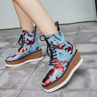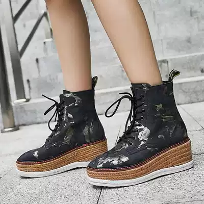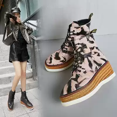 Hong Kong muffin thick-bottom Martin boots women autumn and winter 2021 new leather straw heeled short boots color tie-up heel