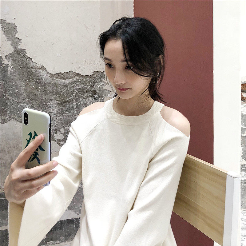 The new female in autumn winter 2023 retro - paste neck long sleeve exposure shoulder - mentsweater sweater A - letter dress
