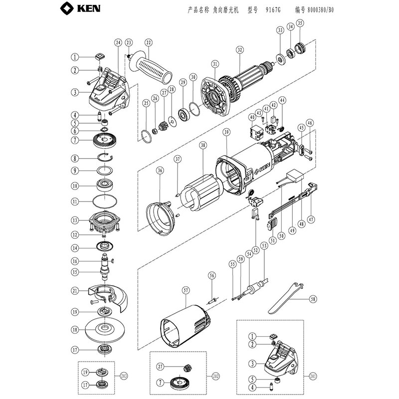 58 Number of wrench 202 Number of gearboxes 201 No. 36 Number of wind shields 52 Number of brushes 38 Number of stator 14 dust cover No. 57 Back cover