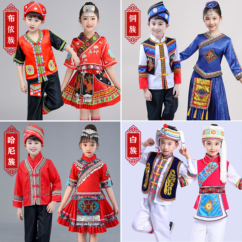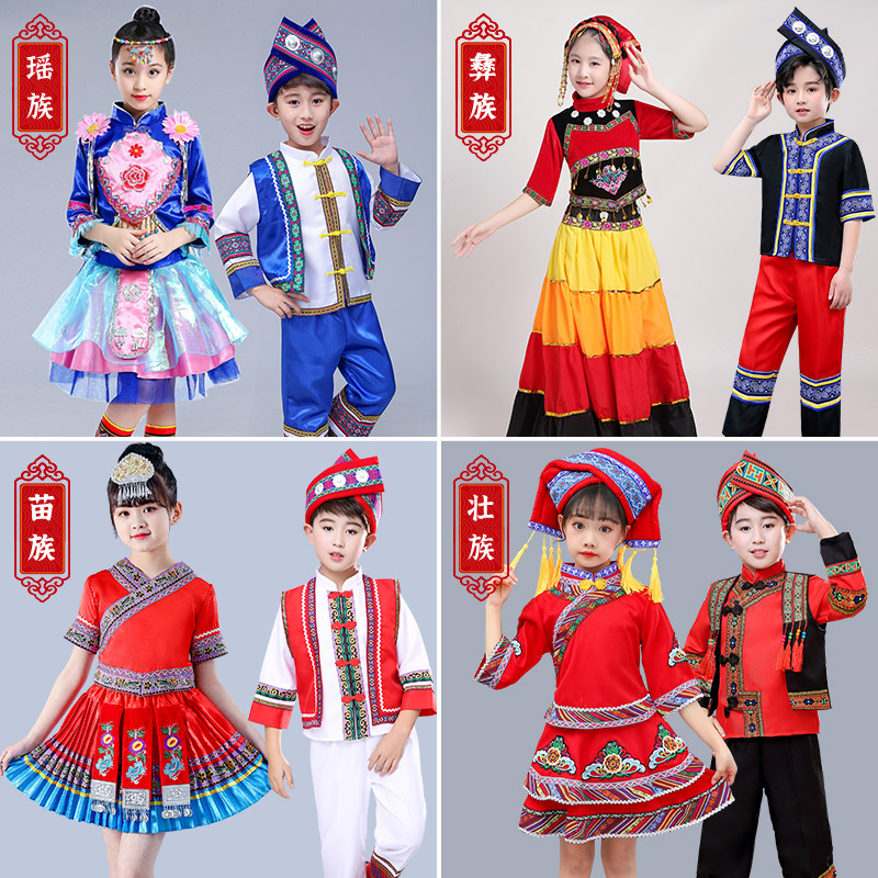 Miao Girls (Headwear Top Skirt) Miao Boys (Headwear Tops Vest Pants) Zhuang Girls (Hat Top Skirts) Zhuang Boys (Headwear Tops)