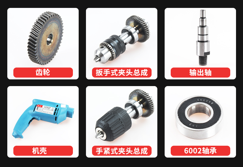 Rotor without bearing Stator switch gear output shaft Carbon brush brush socket power cord Drill chuck (iron) hand tight test chuck Hand tight chuck assembly Iron hairpin assembly 10mm key 6002 Bearing 607