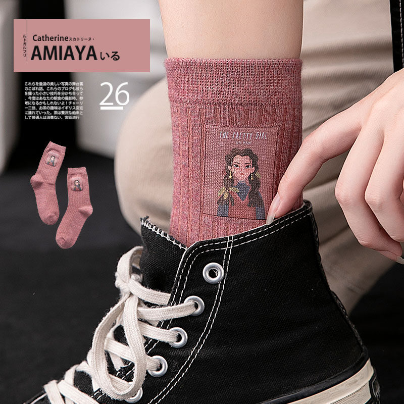 Socks women's mid-tube socks Korean version of ins tide pure cotton stockings street Japanese cute cartoon autumn and winter mid-length piles of socks