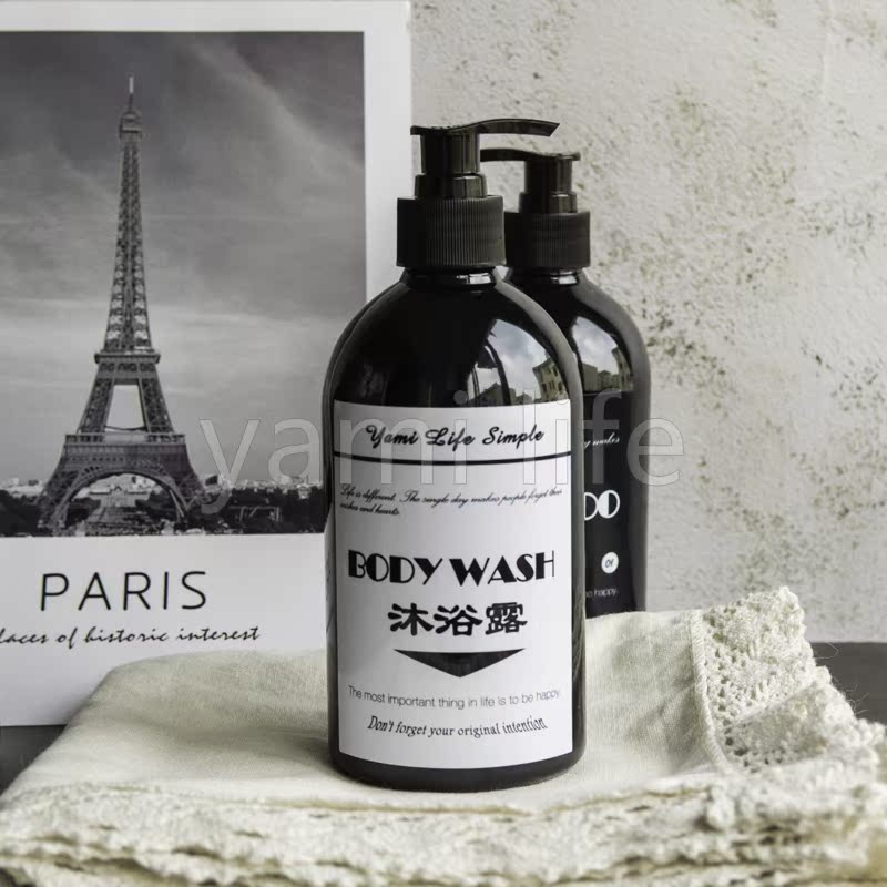 Chinese shampoo, Chinese conditioner, Chinese shower gel, English shampoo, English conditioner, English shower gel, English hand sanitizer, English four-piece set