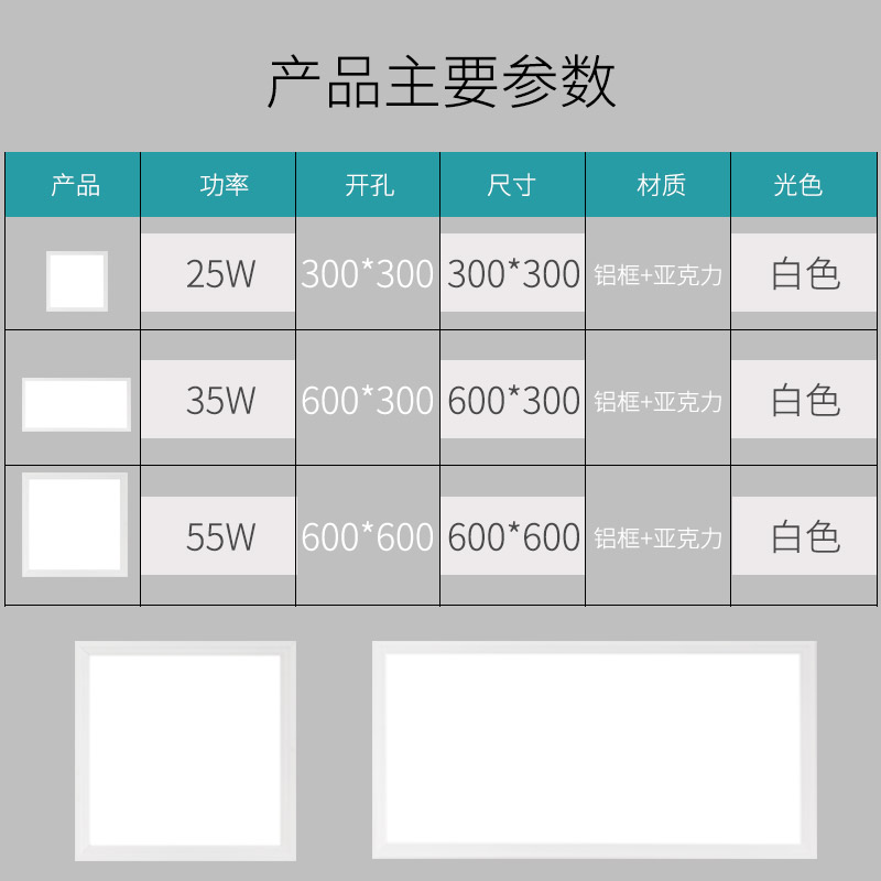 300X300 Square—25W White Light 300X600 Rectangle—35W White Light Tooling 600X600- White Light 50W-No Independent Packaging