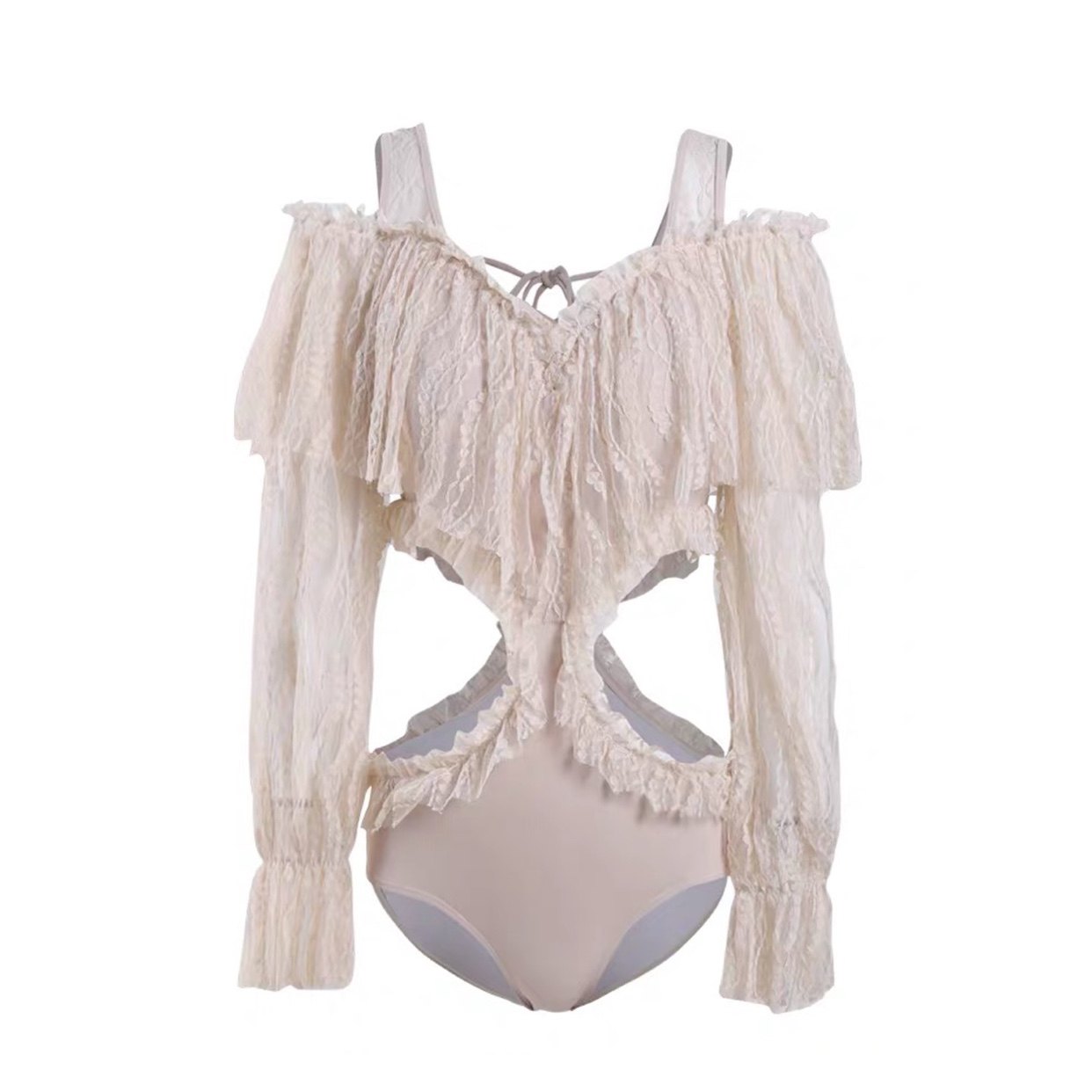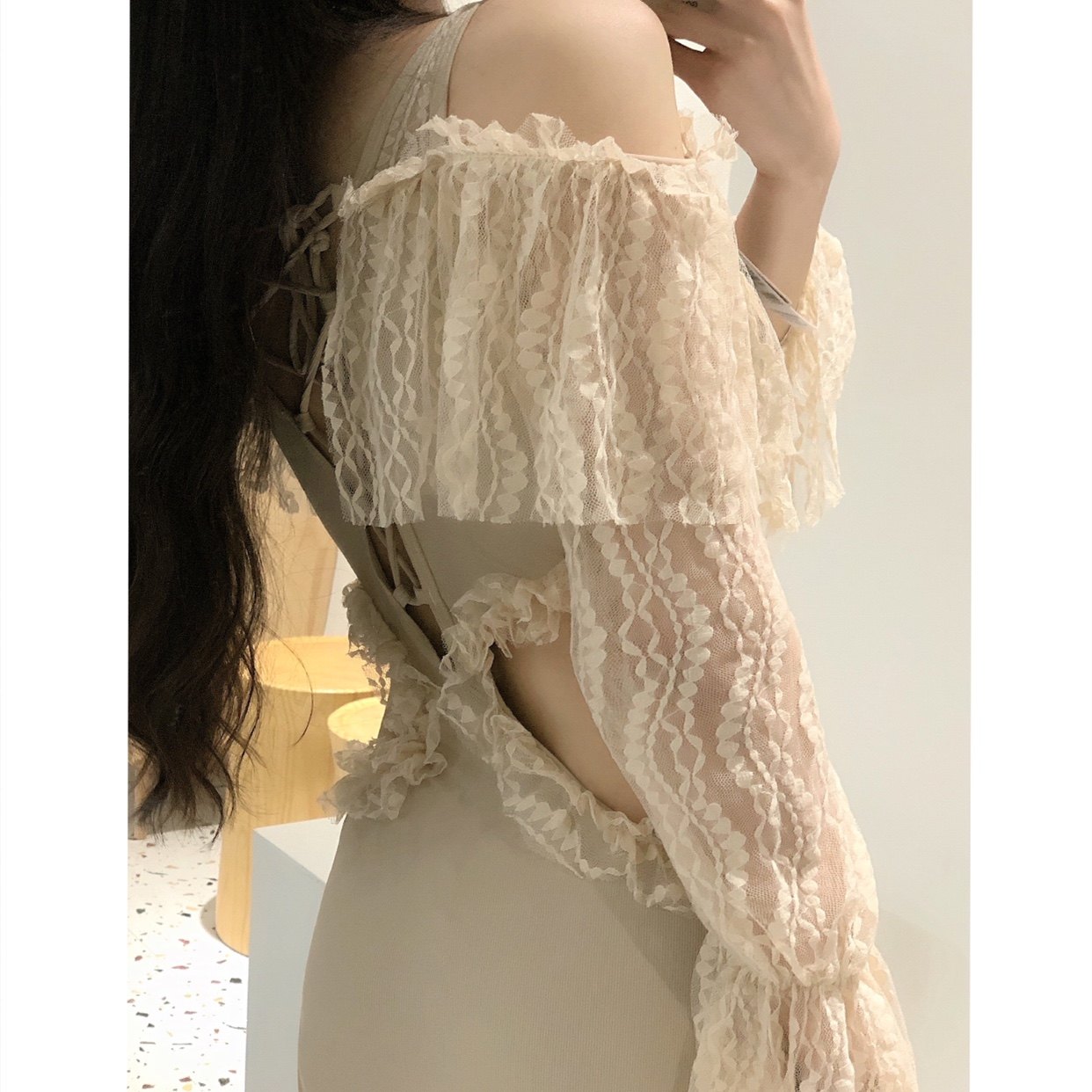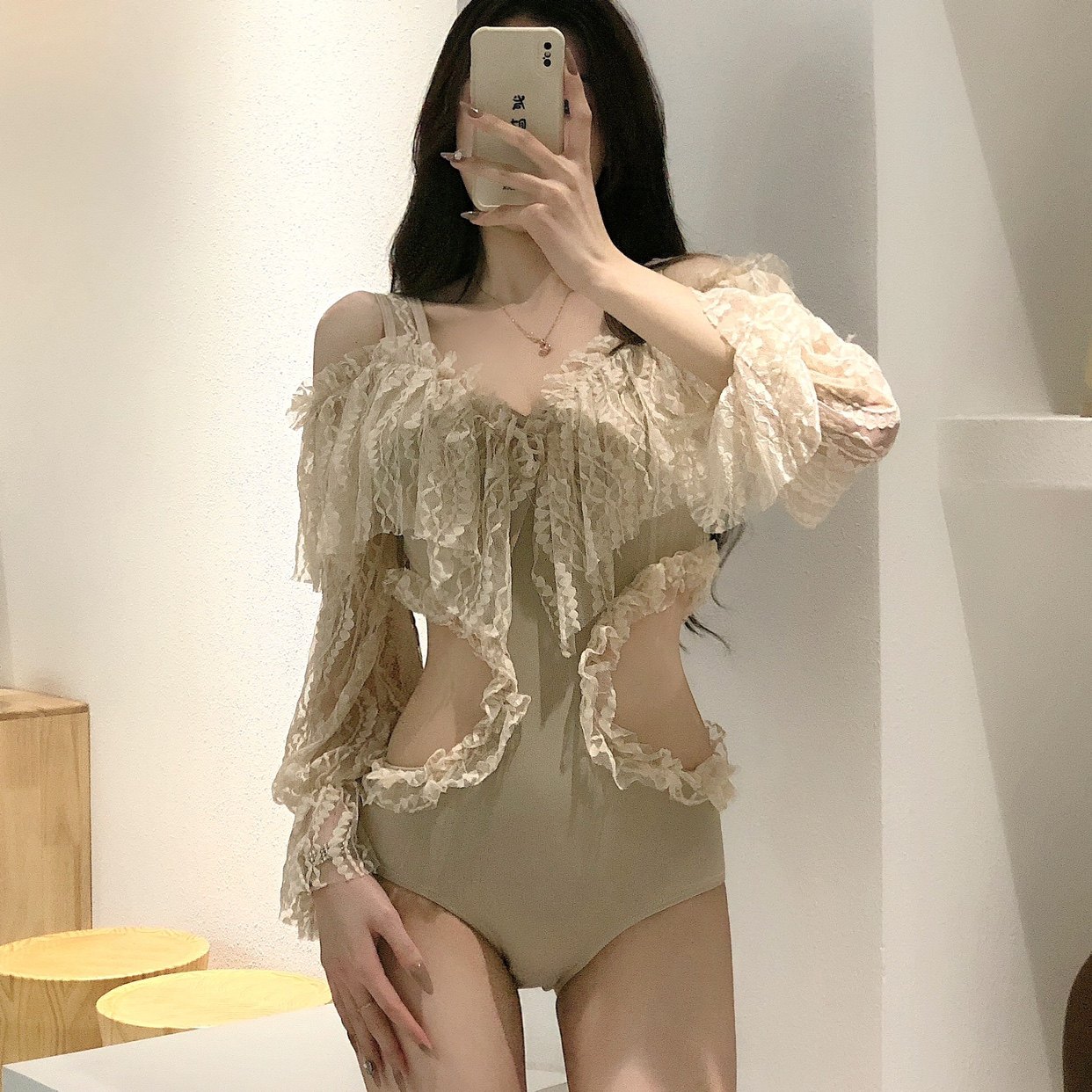 SWIMMING WARM Korean lace small chest sexy fairy long sleeves cover belly slim one-piece hot spring swimsuit for women