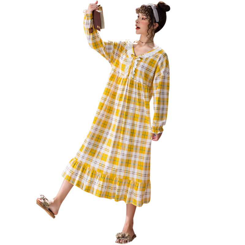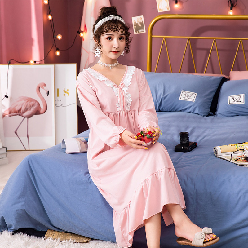 Long sleeve sleeping dress female pure cotton spring and autumn season long version can be outworn with sweet and large size for fat mm loose with chest cushion sleepwear skirt