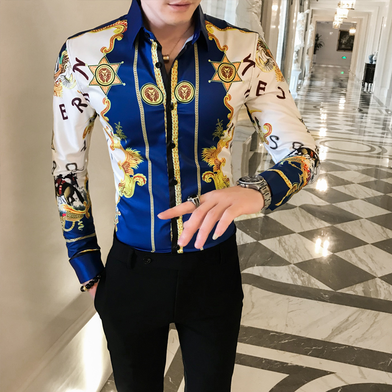Spring 2021 men's slim silky long sleeve flower shirt fashion personality satin shirt singer oil painting performance clothing