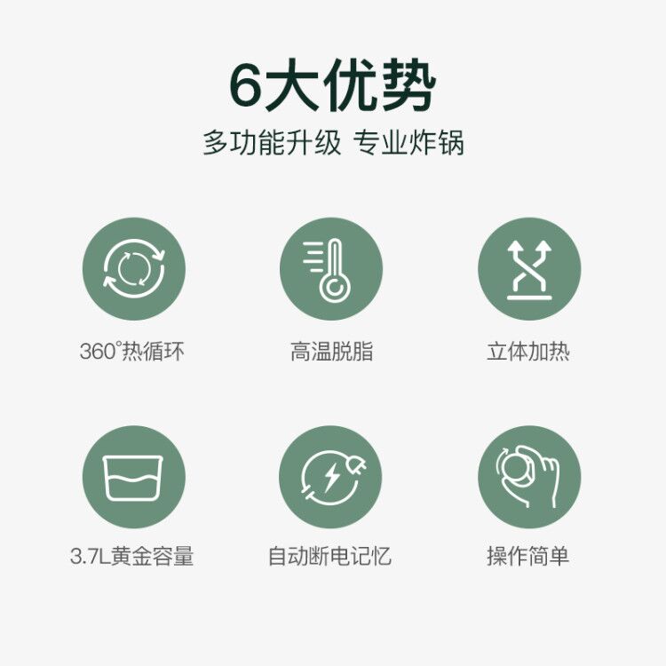 2L (upgrade white) non-stick pan easy to clean Low-fat high temperature de-frying 360 °C uniform heating 3.7L (blue) automatic power off memory function 11 leaf turbine fan cycle heating 3.7L (net red hit) automatic power off memory function 11 leaf turbine fan cycle heating 3.7L (smart blue) microcomputer touch 8 menus optional automatic power off memory function 3.7L (smart green) microcomputer touch 8 menu optional automatic power off memory function 5L family enjoy (green) non-stick pot easy to clean automatic power off memory function 360 °C uniform heating 5L family enjoy (smart LCD touch) automatic power off memory function one-button multi-function menu 8L upgrade large capacity (intelligent LCD touch) automatic power off memory function one-click multi-function menu
