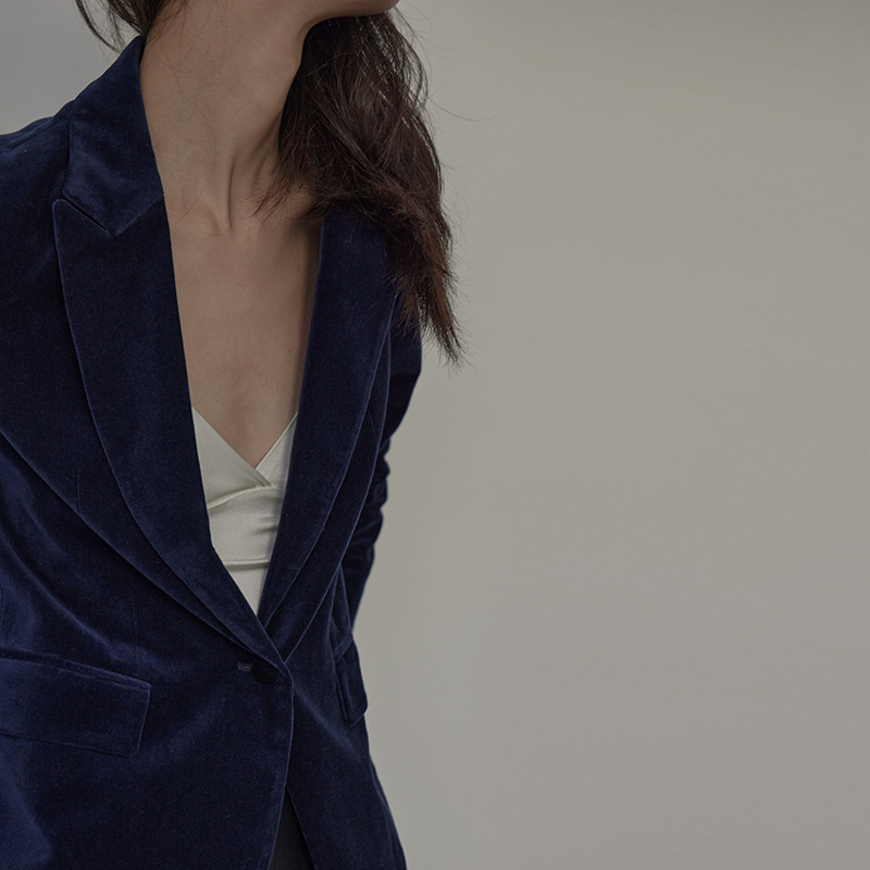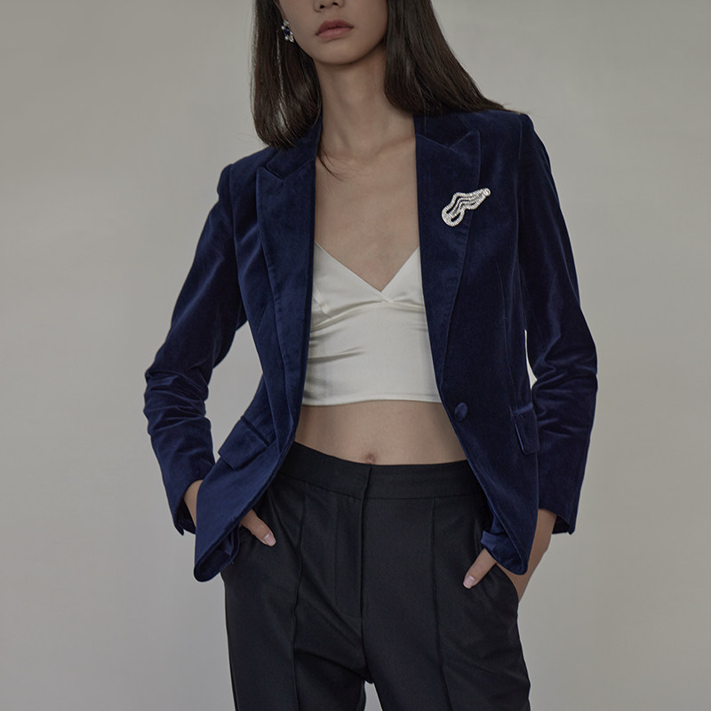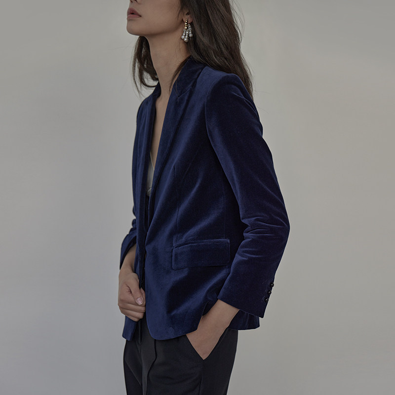 mytopbuyer spring fall dark blue flat suede suit jacket woman casual temperament govelvet short and small western suit