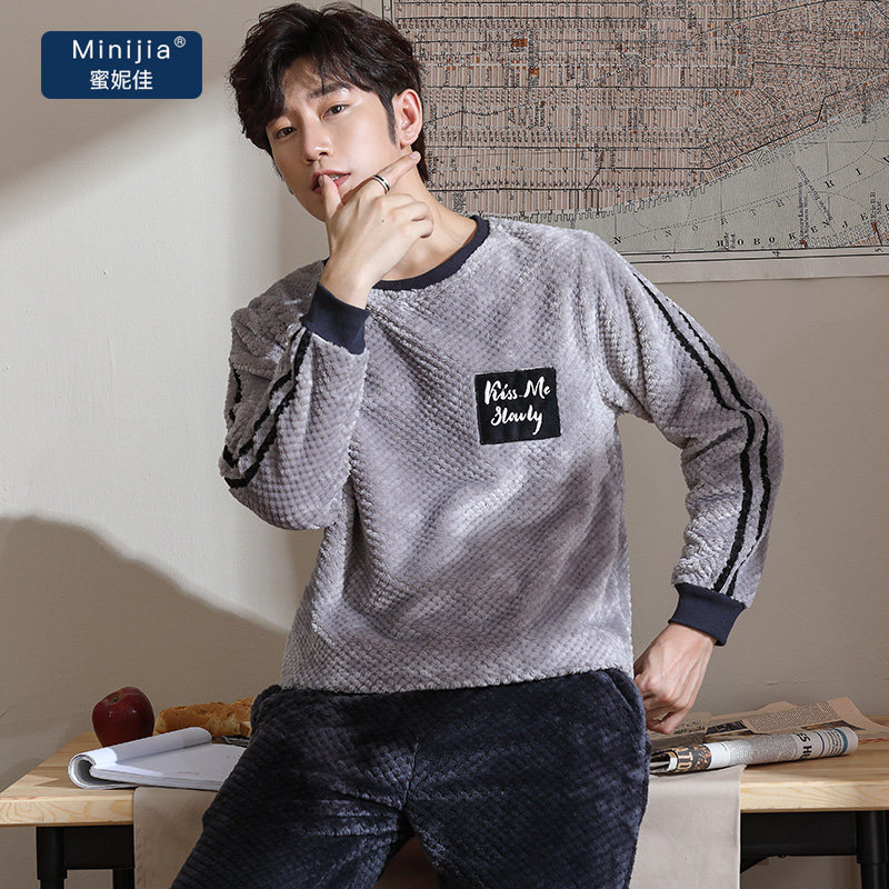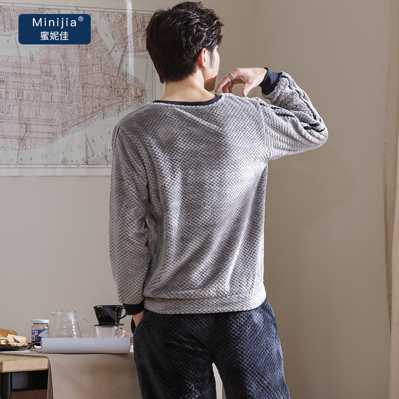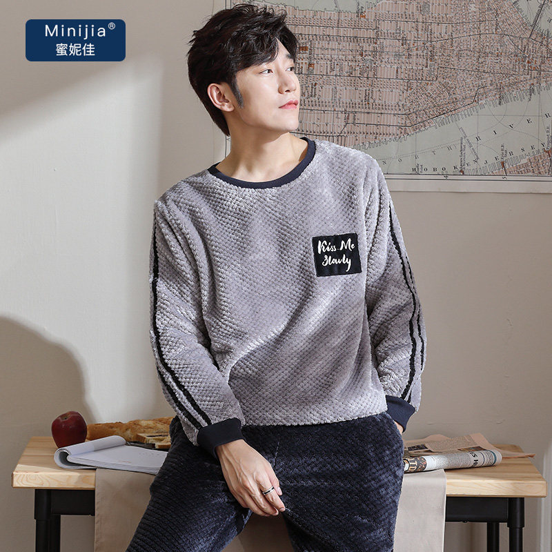 Autumn and winter coral velvet pajamas men winter thickened plus velvet autumn and winter youth warm flannel home suit