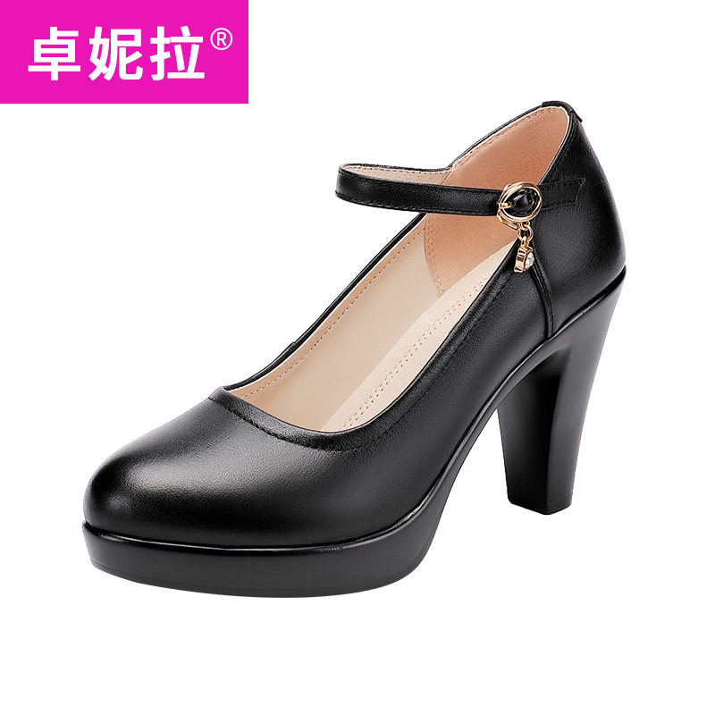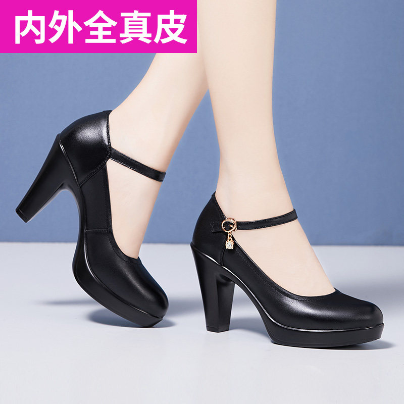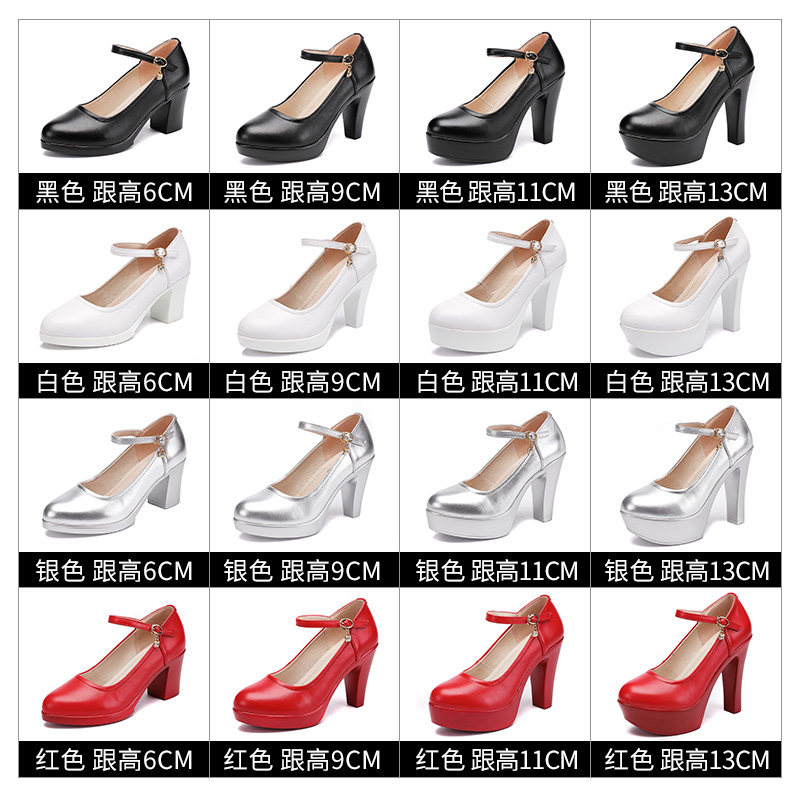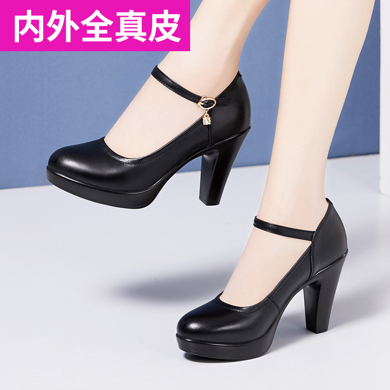 Black round head soft cowhide cheongsam model catwalk high heels waterproof platform thick heel thick sole large size single shoes women