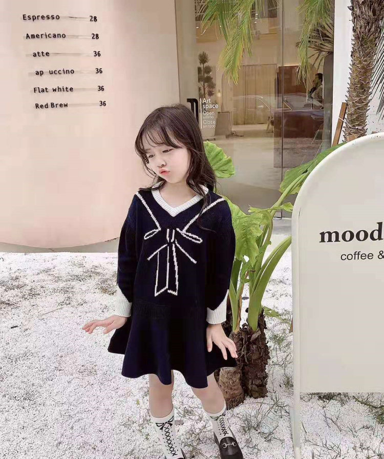 High-end children's dress parent-child college Wind Dress Long Sleeve V Collar Butterfly Knot Cute Knitted Parent-child Dress