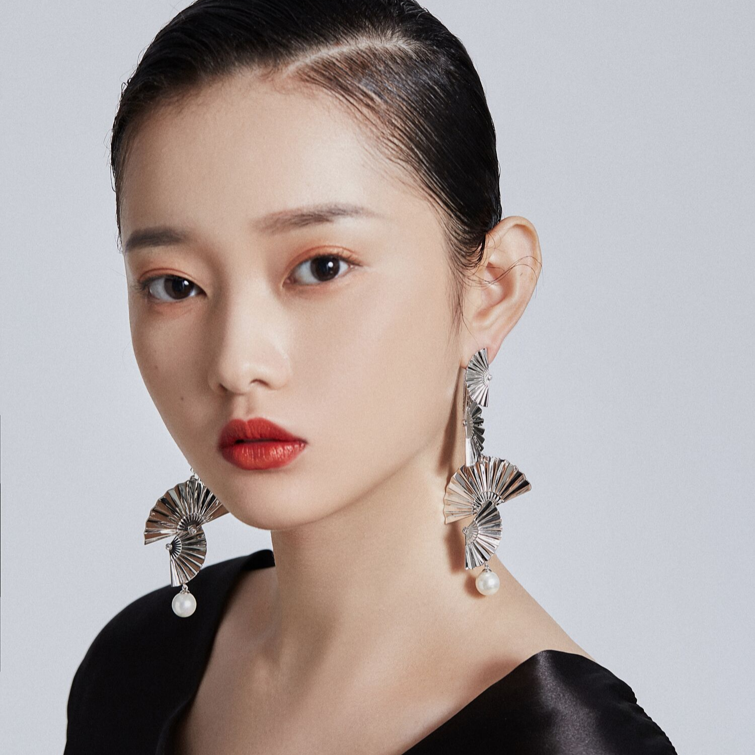 Silver Fan Dance Pearl Earbuke MASISONLUMIERE Beauty Tribute to the Forbidden City of the same Forbidden City
