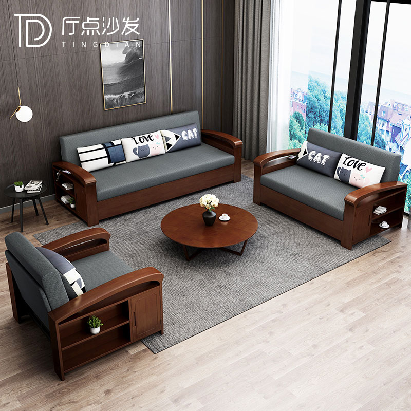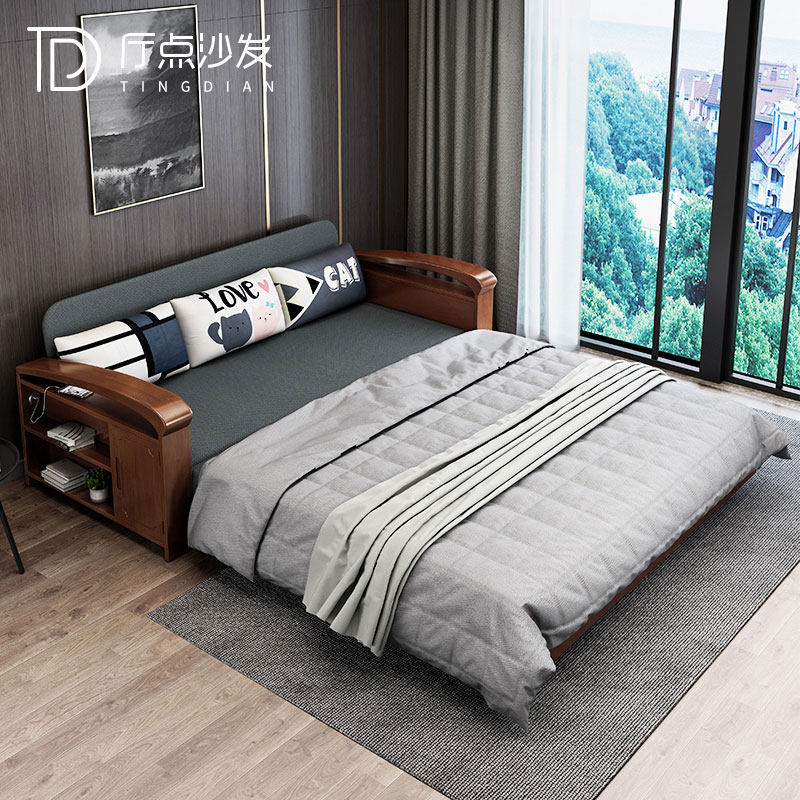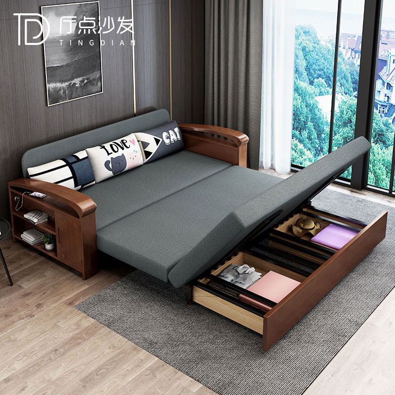 Solid wood multi-function folding sitting and lying simple push-pull dual-use living room small apartment double new Chinese style storage sofa bed