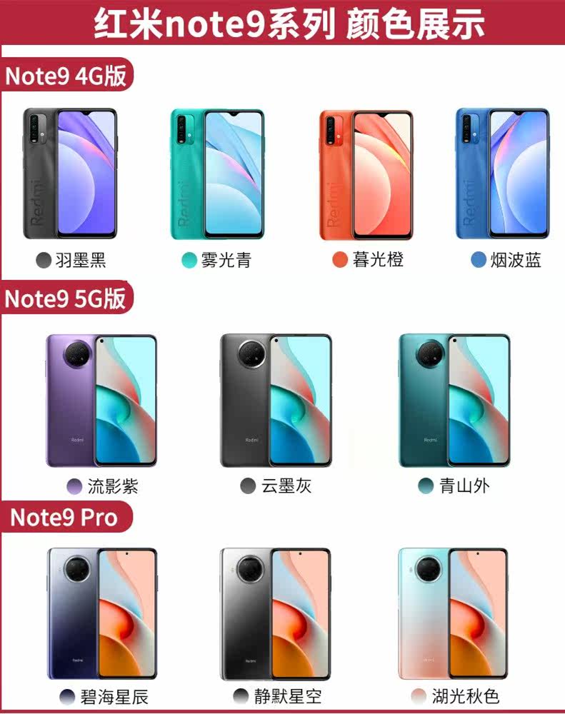 Redmi NOTE9 Feather Black Red Rice NOTE9 Smoke Wave Blue Red Rice NOTE9 Fog Cyan Red Rice NOTE9 Dawn Orange Red Rice NOTE9 Cloud Ink Gray Red Rice NOTE9