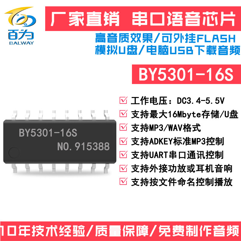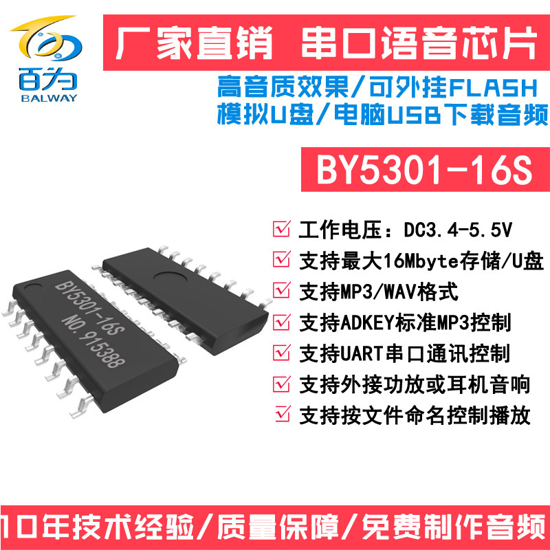 Serial voice IC audio player chip MP3 prompt broadcast analog U disk can change the sound BY5301-16S