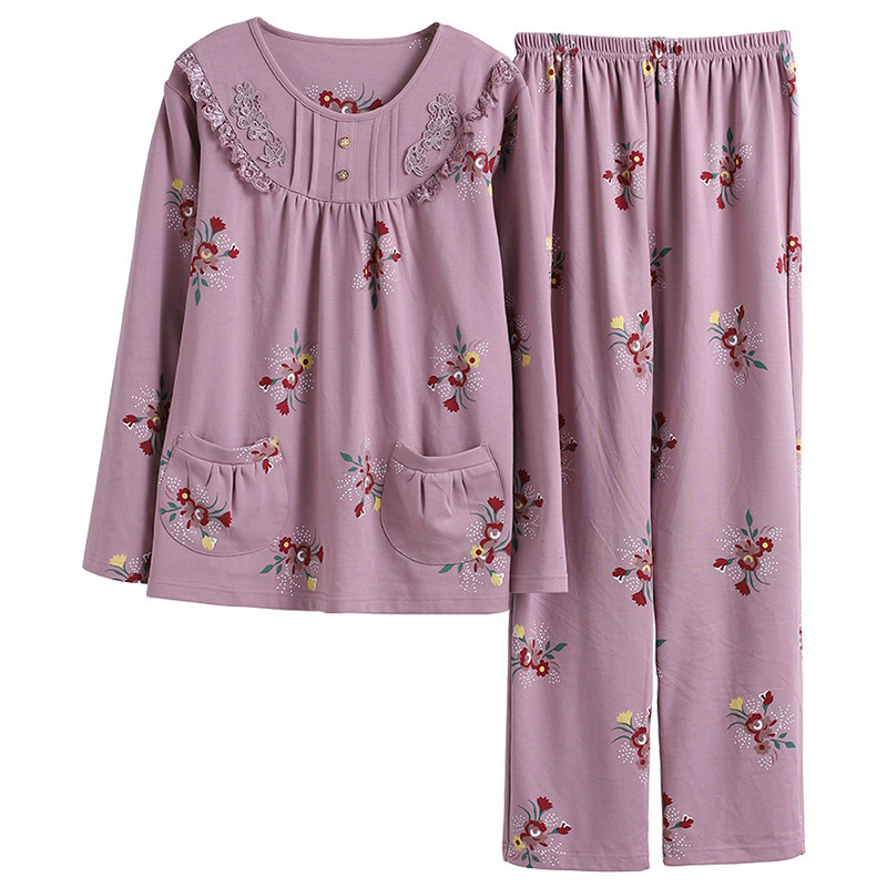 Middle-aged and elderly Long sleeves pure cotton pyjamas women gats up overweight overweight mothers Grandma's fall home suit Spring and autumn