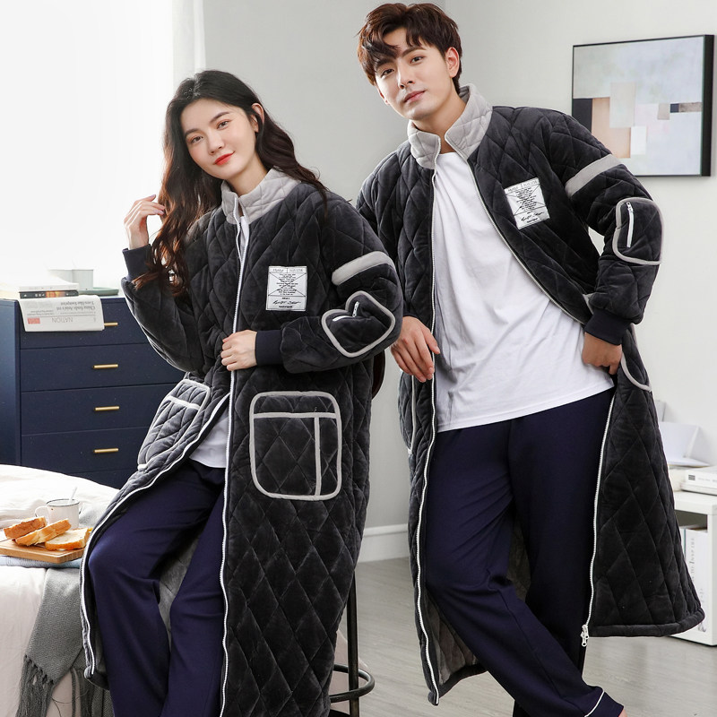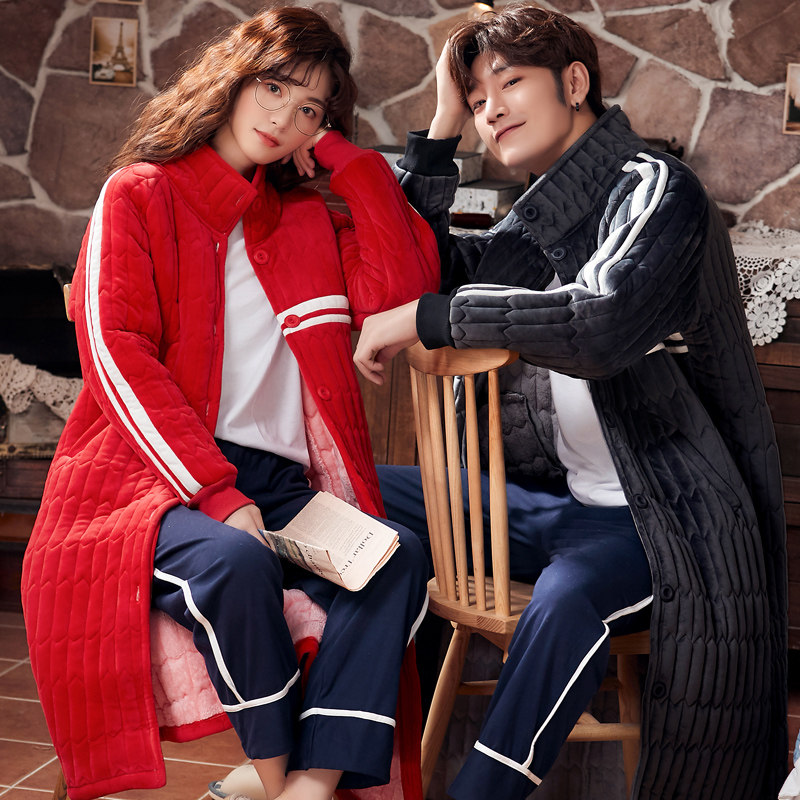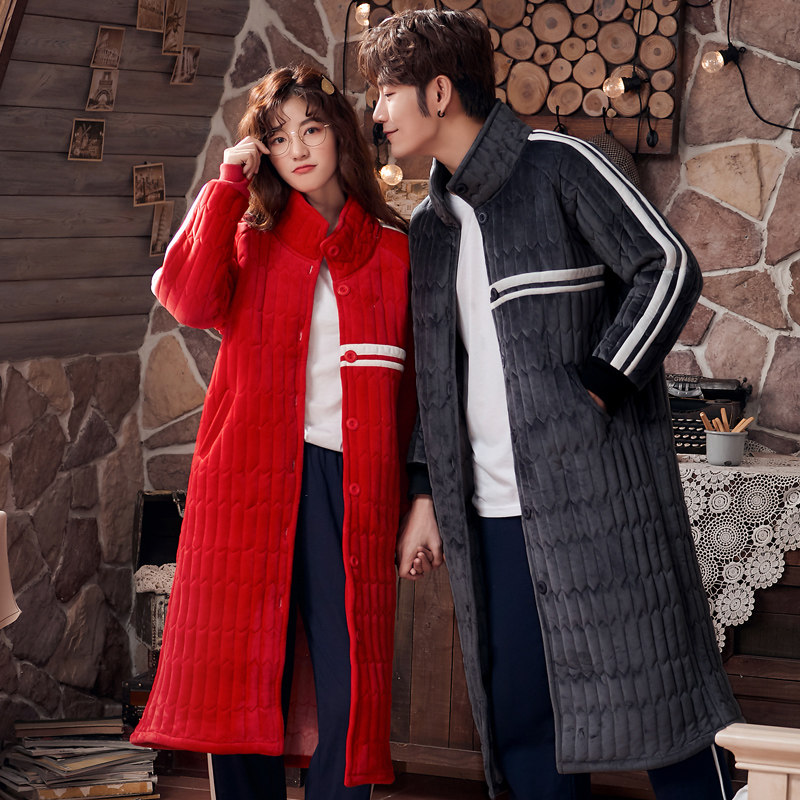 Lovers Sleeping Robes Women Autumn Winter Style Coral Suede Men Thickened with velvety long section External Wearing Triple Clip Cotton Button Pyjamas-Taobao