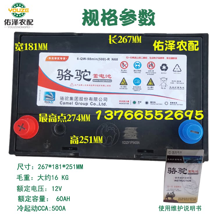 Kubota harvester 688 camel battery 60AH maintenance-free 6-QW-98min (500) starter battery