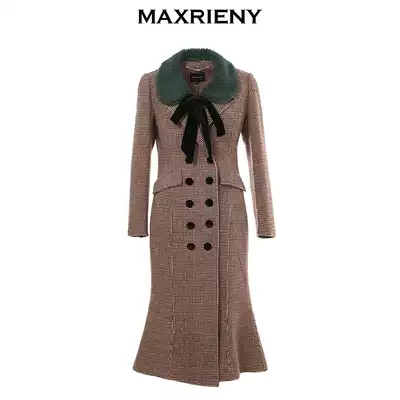 MAXRIENY new retro checkered color fur collar ruffle long wool coat women's plaid coat waist