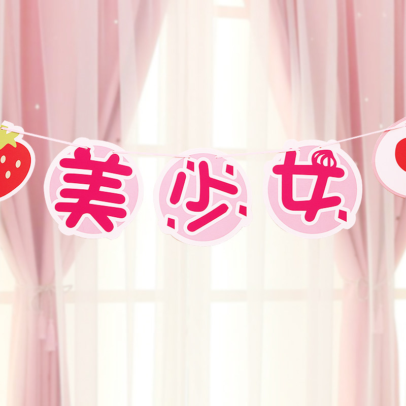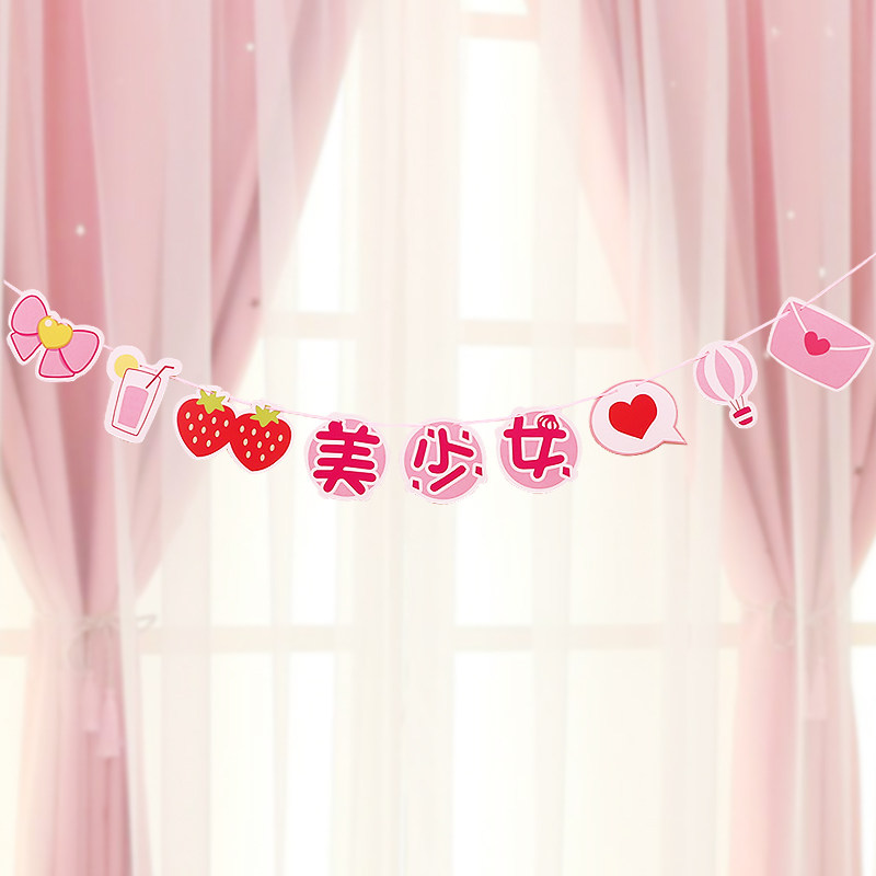 Cartoon beautiful girl little fairy pulling flag net red girl birthday party venue background decoration banner bunting pull flower