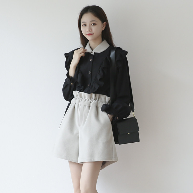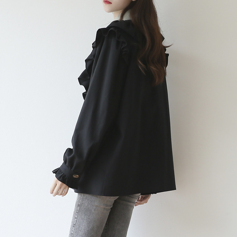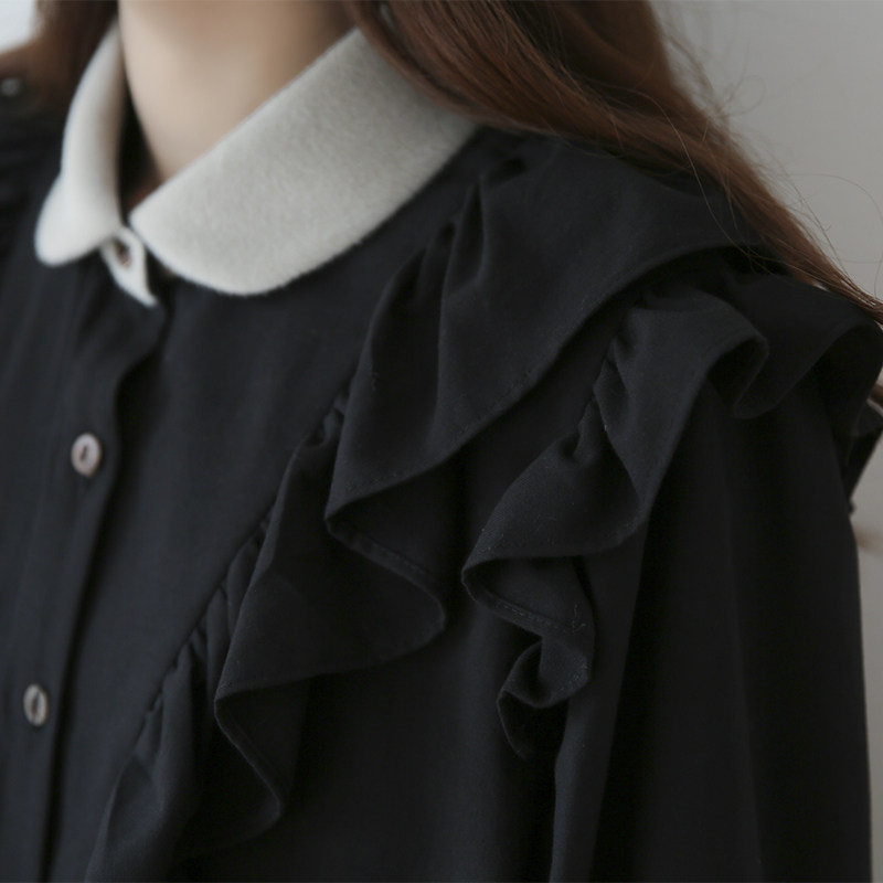 suin women's dress 2022 autumn winter new vintage woman agaric side sweet and beautiful wind shirt doll collar black long sleeve shirt