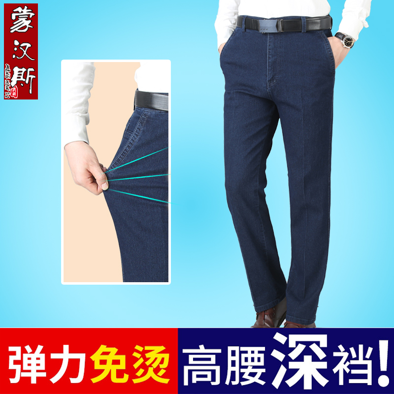 Dad Clothing Pants Winter Plus Suede Elastic Middle-aged Men Jeans Straight Barrel Loose Middle-aged Men's Pants Spring Autumn-Taobao