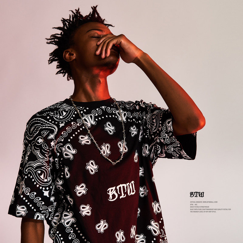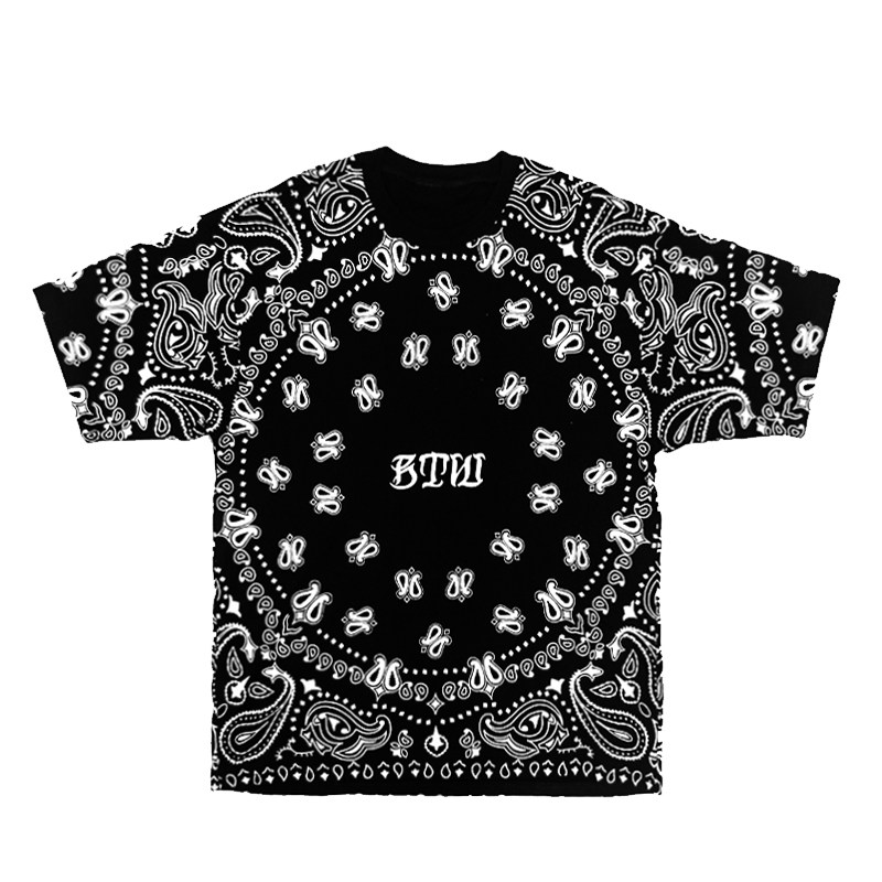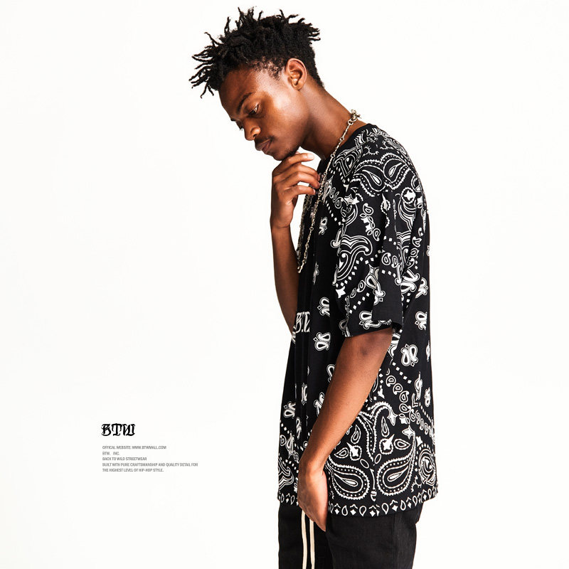 BTW summer loose short-sleeved men's hip-hop street trend half-sleeve dark black personality cashew flower full printed T-shirt