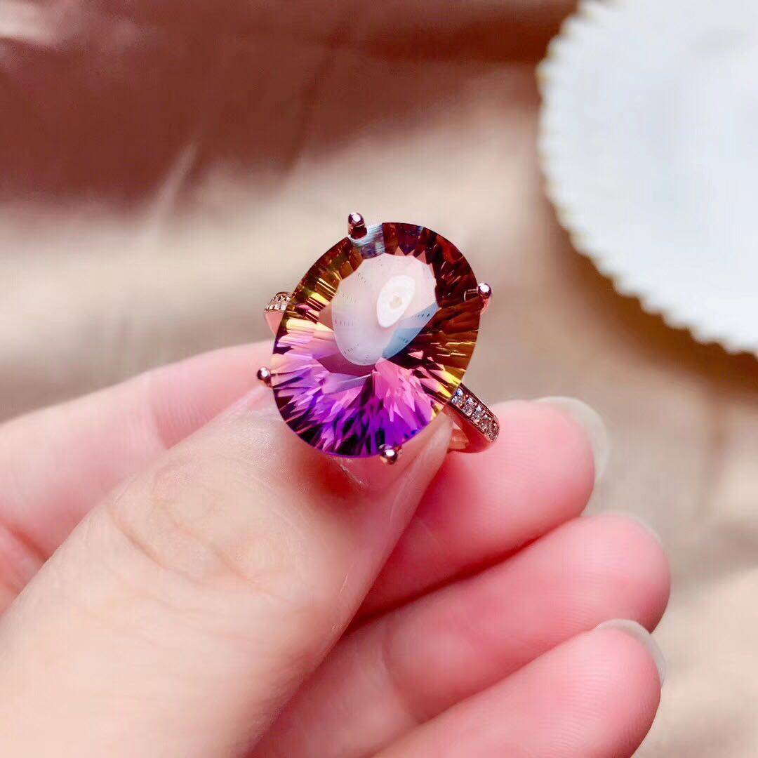 Half purple and half yellow gradient color Zhao Cai Wangfu amethyst full net body Fire burst ring center stone 925 silver