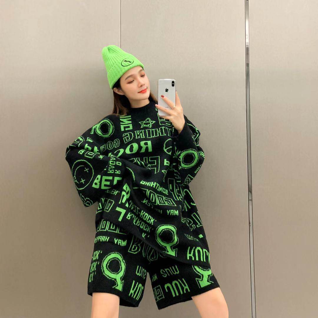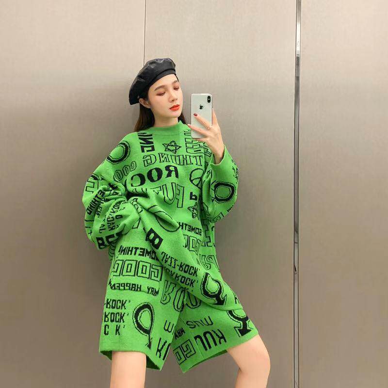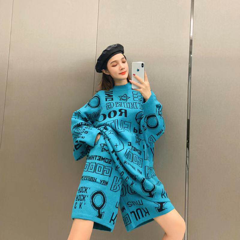 European station autumn and winter loose wool knitted wide-leg sweater shorts suit female fashion casual western style two-piece set