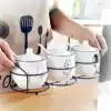 Seasoning box Porcelain Separate set Household seasoning bottle with lid Spoon Salt jar Combination seasoning bottle Iron rack