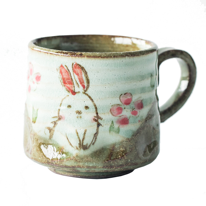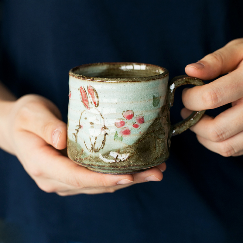 Japanese Seto-yaki hand-painted underglaze coarse pottery flower cat Cherry Blossom Rabbit Vintage couple mug Coffee tea cup