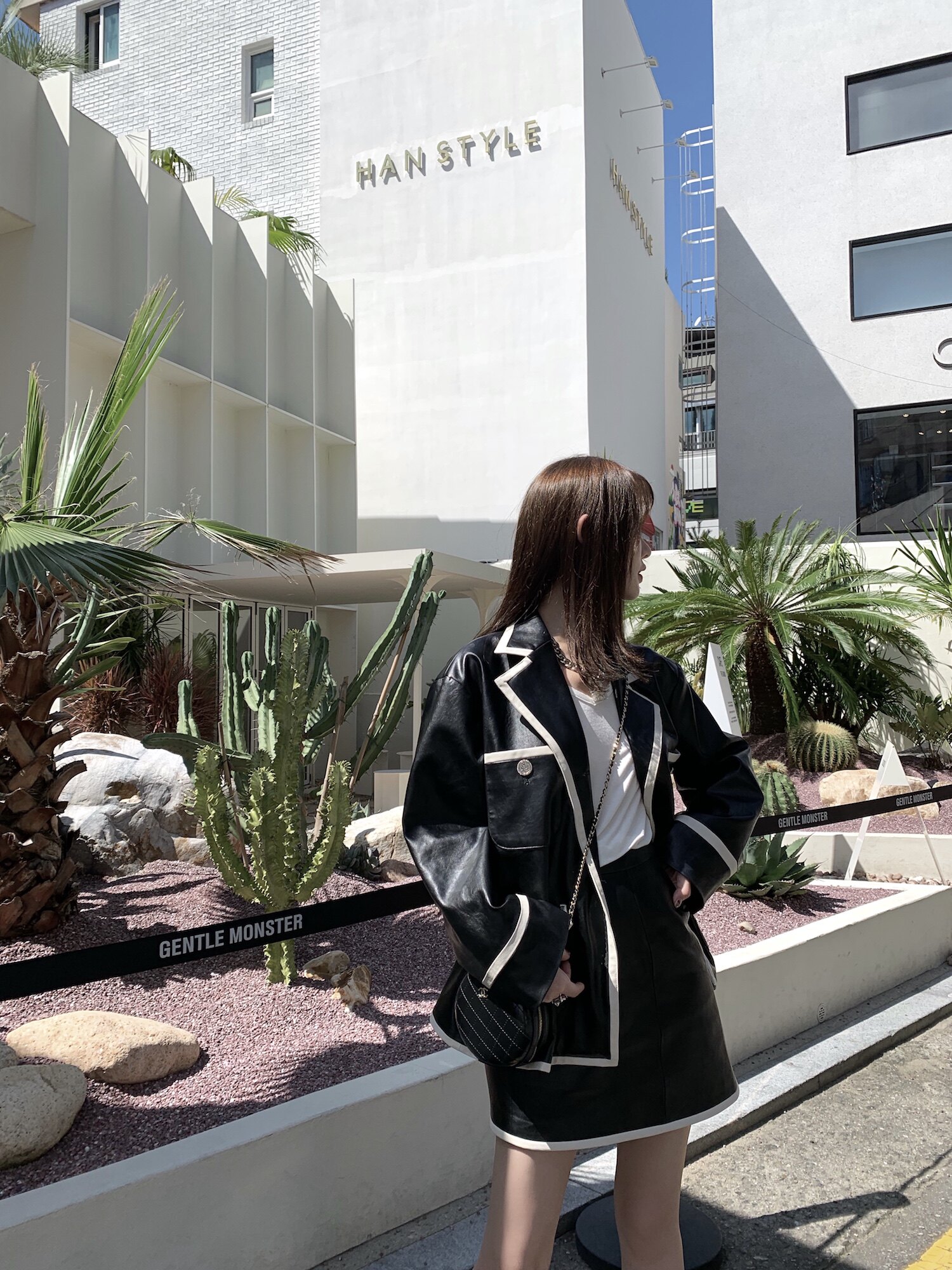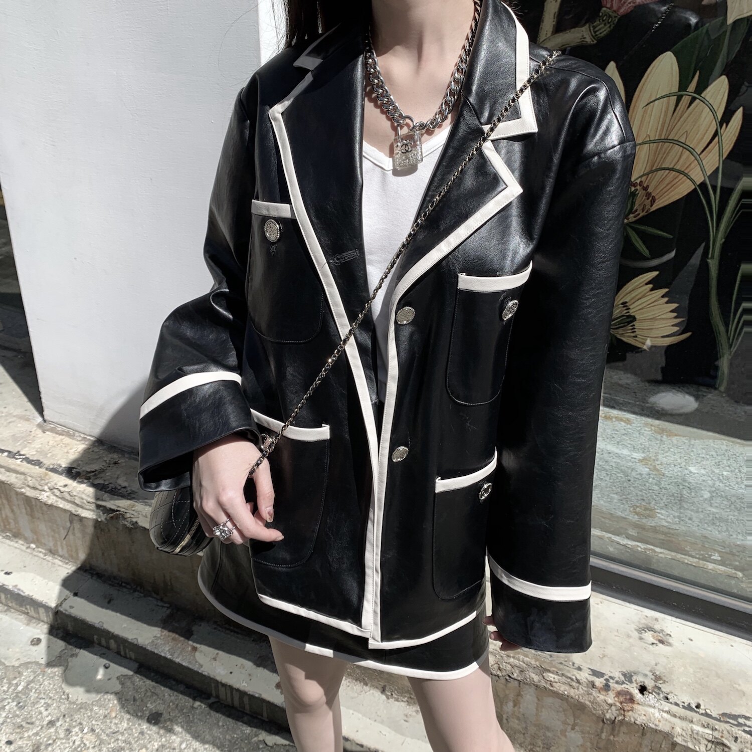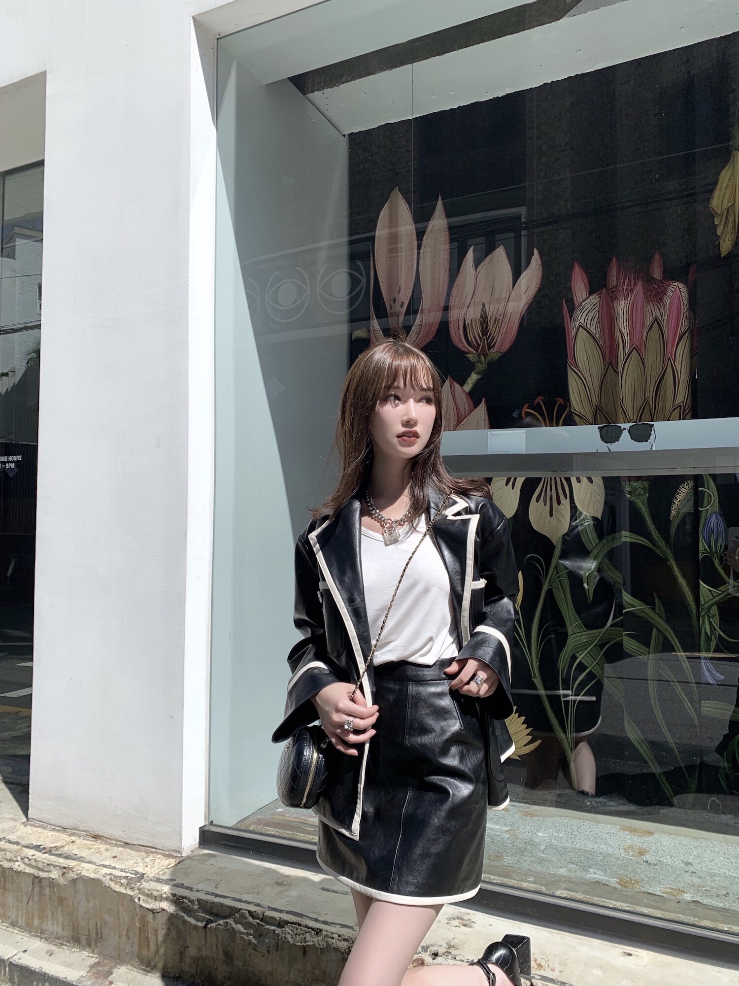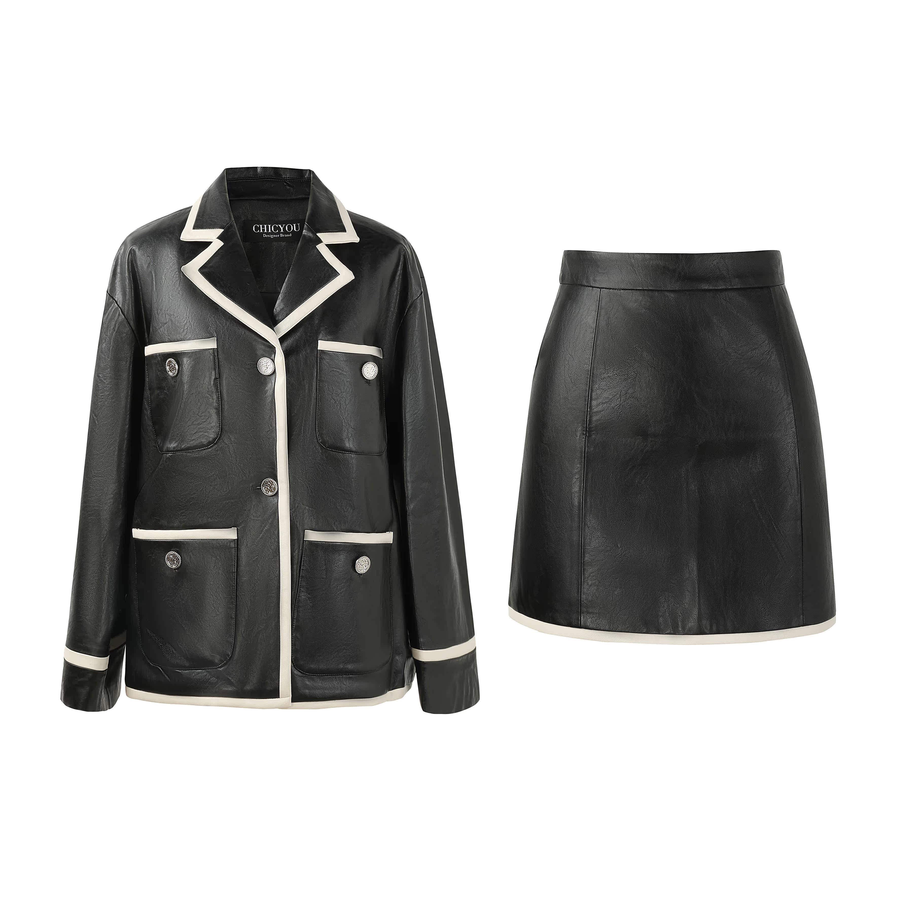 (50% clearance) fashionable rich girl retro small fragrance black pu leather suit skirt suit