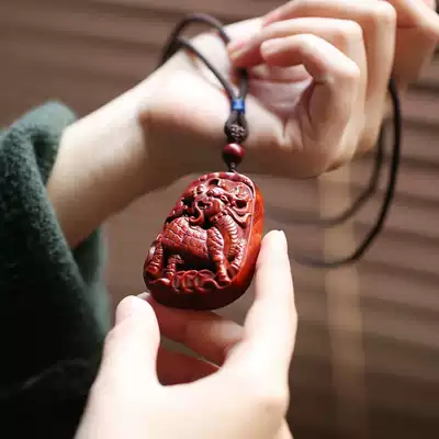 Indian small leaf red sandalwood unicorn wood carving mahogany old pendant men's and women's Gift necklace wooden pendant handlebar