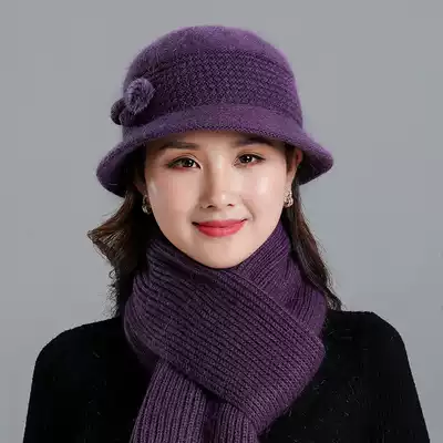 Hat female autumn and winter elderly rabbit hair knitted hat mother hat scarf plus velvet warm wool hat two-piece set