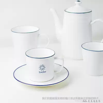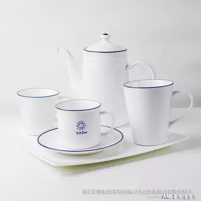 SUN FACE STRAIGHT BLUE-edged MILK CUP 225ml BLUE-edged BAMBOO BREAKFAST CUP 320ml BLUE-edged HORIZONTAL LENG COFFEE CUP 200ml BLUE-edged KETTLE 825ml WIDE 205mm SUN FACE CUP and SAUCER TWO PIECES